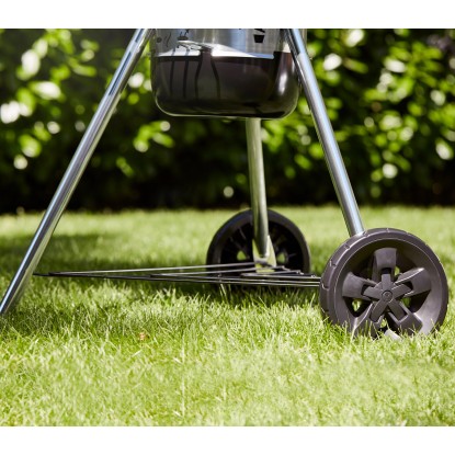 Ezenkívül a porcelánbevonatú gömbgrill fedelén hő- és UV-álló Duroplast fogantyú található. A szükséges grilleszközöket a grillsütőn lévő evőeszköz kampókon tárolhatja. A robusztus, formára préselt, minden időjárásban használható gumikerekeknek köszönhetően a Weber gömbgrill könnyen mozgatható, és stabil.Weber - tapasztalat és minőség 1952 óta