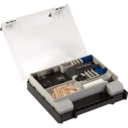 A tiplis dobozban a gyakorlatban bizonyított tartozékok is megtalálhatók, amelyek segítik a munka precíz végrehajtását. A dübelező sablon segít abban, hogy függőleges lyukakat fúrjon a munkadarabba. Ehhez jönnek még a különböző magasságú távtartók, amelyek a pontosan meghatározott furatmélységről gondoskodnak. A dübeljelölők segítenek a szemközti furat pontos megjelölésében. Ez fontos előfeltétele annak, hogy összeszerelésekor az összes munkadarab tökéletesen illeszkedjen egymáshoz. Nem utolsósorban a táska egy 60 ml-es tubusban enyvet is tartalmaz a munkálatok befejezéséhez. A tiplis doboz egy átgondolt ötlet, amely a kezdetektől megkönnyíti a tiplikkel végzett munkálatokat.