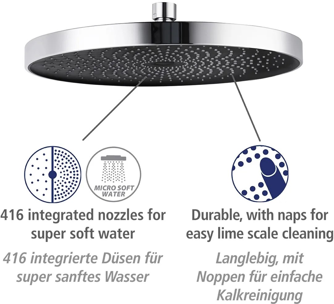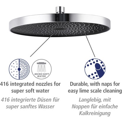 A Wenko esőzuhany 416 fúvókával rendelkezik. A vízcseppek rendkívül finoman és puhán hullanak Önre és valódi spa élményt teremtenek otthoni zuhanyzójában. Ennek során különösen ügyeltünk arra, hogy zuhanyzás közben ne keletkezzenek zavaró zajok. A fröccsenő víz mennyisége szintén kevés. Kezdjen minden napot egy nyugtató, jóleső zuhannyal és vigye a wellness nyaralást közvetlenül a saját fürdőszobájába.