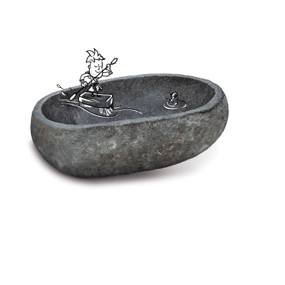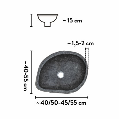 Ezzel a sötét folyami kőből készült, kézzel készített, ráültethető mosdókagylóval maga a természet költözik otthonába. A mosdó kívülről megtartotta a kő eredeti formáját. A természetes oxidáció révén egyedülálló színárnyalatok jönnek létre, melyeket a polírozott belső felület remekül kiemel. Az egyedi ovális kialakítás tökéletesen harmonizál a robusztus természetes kővel.