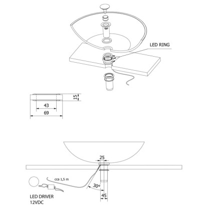 Sapho Alátét mosdó és mosdótartó pult közé LED világítással 12V 1,2W 5000-5500K