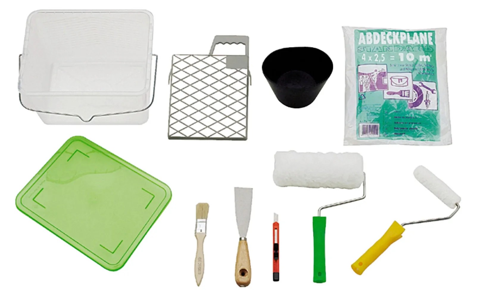 A renoválási munkákhoz tökéletes kezdő felszerelést nyújt a 10 részes LUX-TOOLS renoválókészlet. Ez a készlet egyszerre biztosít mindent, amire szüksége van a lakása festéséhez vagy komplett renoválásához. A készlet egy 8 l-es vödörből, egy 18 cm-es vestanhengerből, egy 10 cm-es perlonhengerből, egy perlonnyélből, egy műanyag rácsból (18 cm x 21 cm), egy spatulyából (40 mm), egy gipszelőedényből, egy laposecsetből (25 mm), egy univerzális késből és a szennyeződés elleni védelemre szolgáló (4 m x 2,5 m-es) védőfóliából áll.