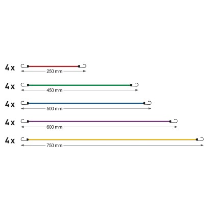 A gumipók készlet különböző méretű feszítőhevederekből áll, amelyek a terheléstől függően alkalmazhatók. A csomagban összesen négy különböző hosszúságú heveder található. Mivel a gumipók készlet megfelel a DIN EN-12195-2 szabványnak, a közúti forgalomban is gond nélkül használható.