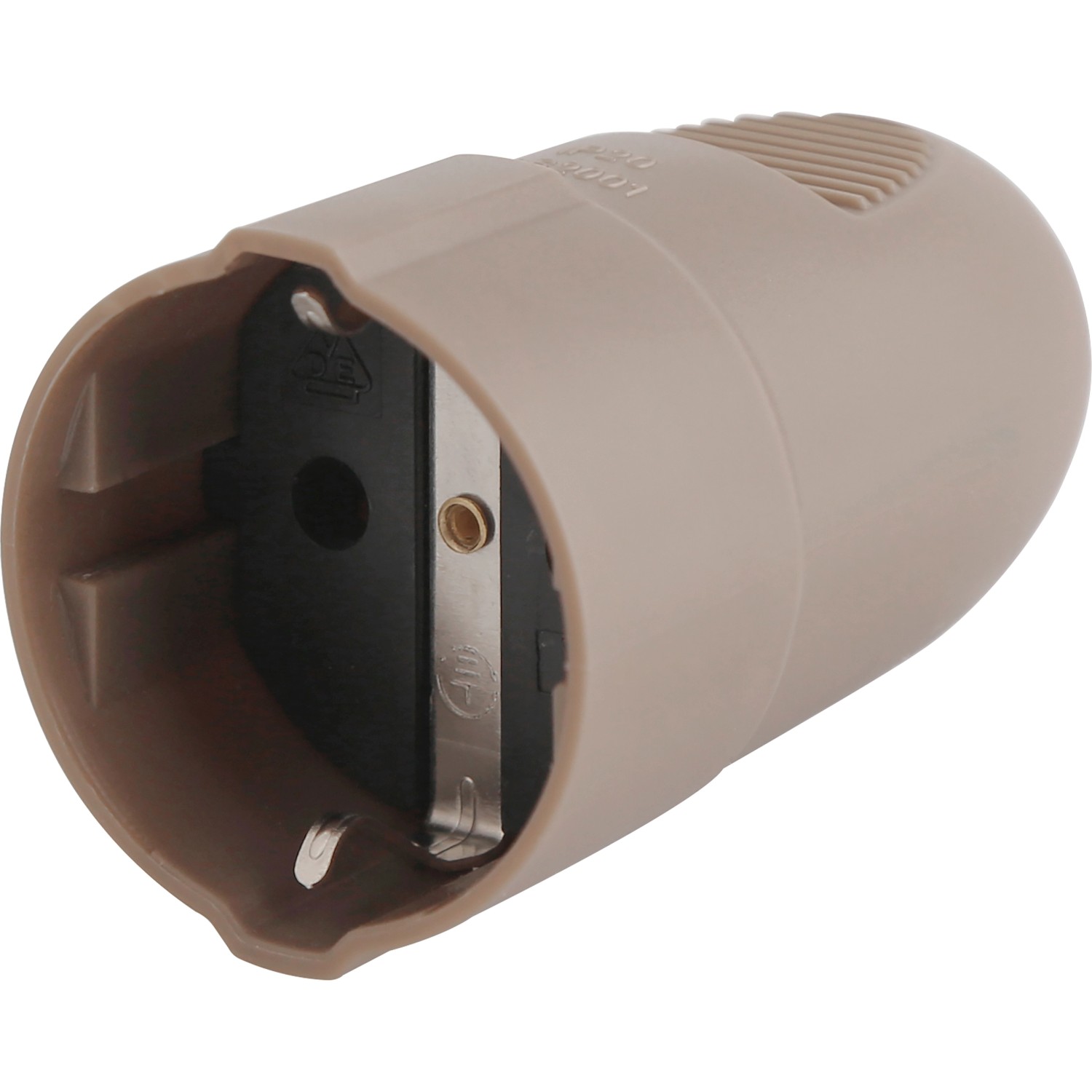Az erős műanyagból készült, barna védőérintkezős lengőaljzat biztonságos csatlakozórendszerként szolgál. Névleges feszültsége legfeljebb 230 V, névleges áramerőssége 10 A és 16 A között van. IP20 védelmi osztálya által kizárólag beltéri használatra alkalmas. Ezenkívül praktikus védelemmel rendelkezik a kábel megtörése ellen.