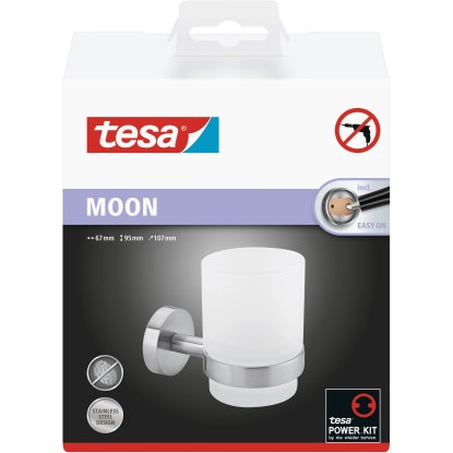 A lekerekített tesa MOON fogkefetartó pohár praktikus kiegészítő, mely a pohár homokfúvott üvegét a konzol rozsdamentes acél hatásával kombinálva vonzó összhatást kínál. A felületen nem látszanak az ujjlenyomatok. Mivel fúrás helyett ragasztós megoldással lehet rögzíteni, bárhová teheti a fürdőszobában, és amiatt sem kell aggódnia, hogy a fal és a csempe megrongálódna. Bármikor gyorsan, nyomtalanul eltávolítható. Ezenfelül a fogkefetartót egyszerűen újra fel is használhatja, és egy új BK20 adapterrel máshová rögzítheti.