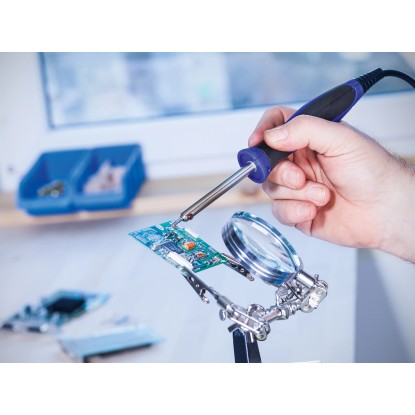 A LUX-TOOLS ívelt heggyel rendelkező forrasztópáka kiválóan használható a mikroelektronikában, például nyomtatott áramköri lapok forrasztásához. Teljesítménye 15 W, maximális hőmérséklete 360 "C. Rövid, kb. 2,7 perces felfűtési idejének köszönhetően néhány percen belül használatra kész.