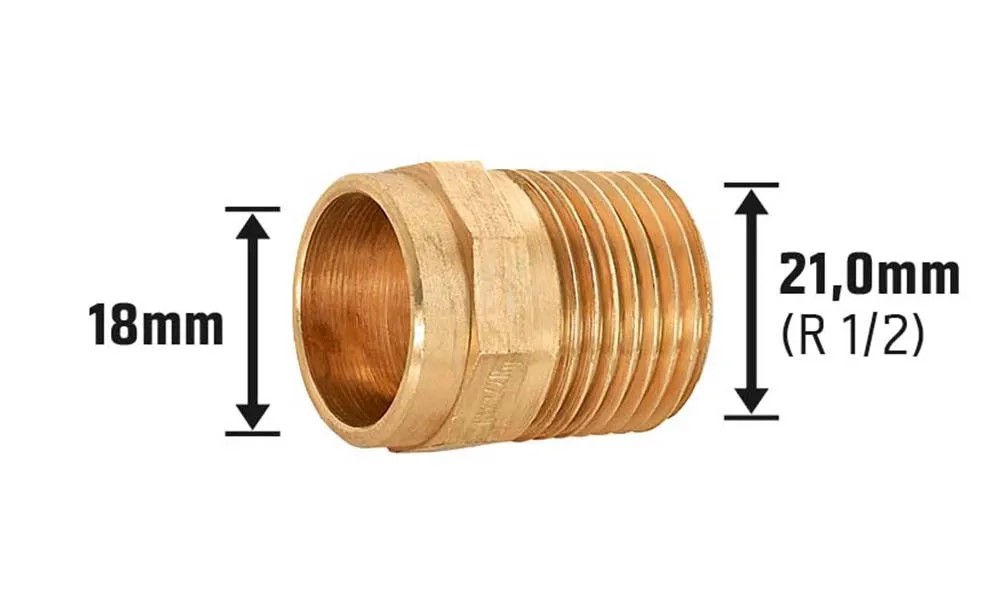 18 mm-es csőátmérő és 21 mm-es (R 1/2) külső menet közötti átmenetet tesz lehetővé. Az összeszereléshez a közcsavart össze kell csavarozni, illetve forrasztani a csőcsatlakozóval. Az összekötőelem ivóvízrendszerekhez is használható.