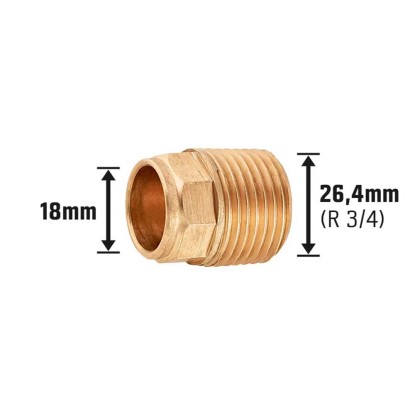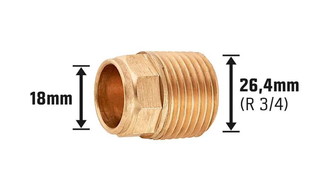 18 mm-es csőátmérő és 26,4 mm-es (R 3/4) külső menet közötti átmenetet tesz lehetővé. Az összeszereléshez a közcsavart egyszerűen össze kell csavarni a csőcsatlakozóval, majd össze kell forrasztani. Az összekötőelem ivóvízrendszer szereléséhez használható.