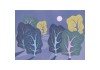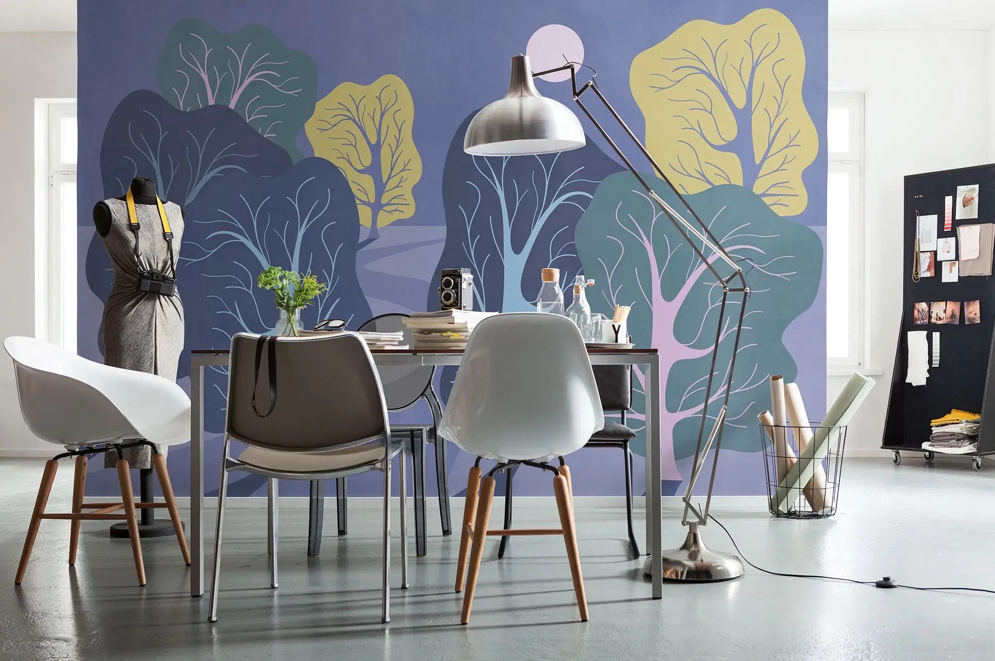 Modern és szemet gyönyörködtető tapéta sötétlila háttérrel, amelyen a stílusos faillusztrációk modern esztétikát mutatnak. A világító holdnak köszönhetően egy éjszakai jelenetet láthatunk, amitől a tapéta hangulata lenyűgöző.