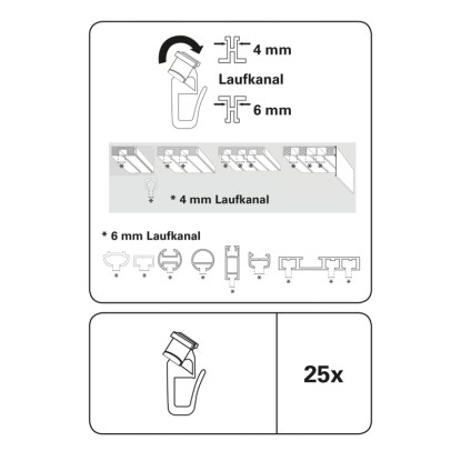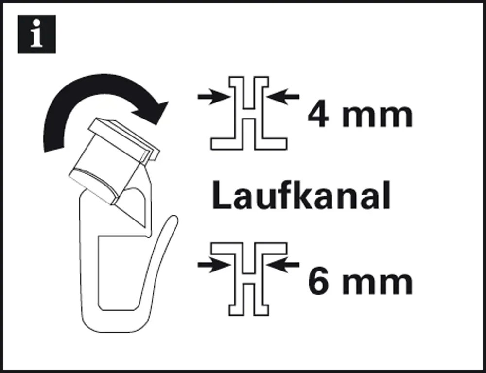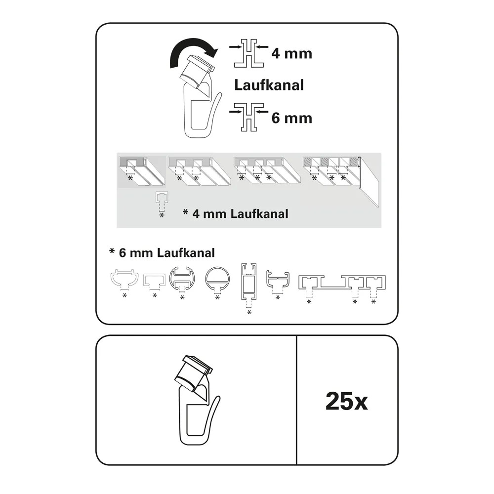 Elfordítható fejének köszönhetően a Gardinia Duo X csúszka függönysínekhez és belső csúszású sínnel vagy 4, illetve 6 mm-es futóhoronnyal rendelkező függönyrudakhoz egyaránt alkalmas. Népszerűségét könnyű kezelhetőségének köszönheti. A csúszka bármilyen helyzetben egyszerűen behelyezhető a függönysínbe vagy a függönyrúdba. A csúszka 90 fokos elfordítással rögzül a helyén. Műanyagból készül, így egyszerre könnyű és stabil. Fehér színéből és formájából adódóan nem feltűnő, és könnyű függönyök, illetve sötétítőfüggönyök felakasztására egyaránt alkalmas. A csomag 25 csúszkát és ráncszedő akasztót tartalmaz.