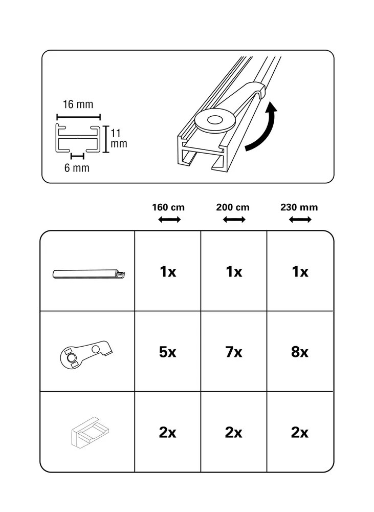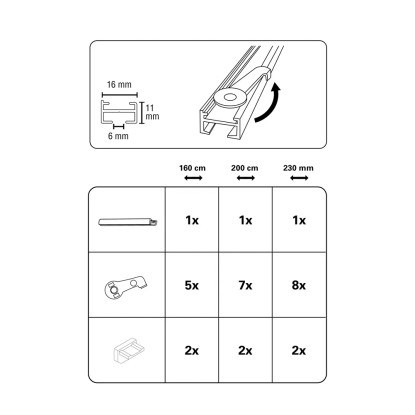 Az alumíniumból készült Lucy 1 pályás függönysín alig észrevehető a kb. 11 mm-es magasságának és a kb. 16 mm-es sínszélességének köszönhetően. A műanyag mennyezeti tartók megakadályozzák a sín karcolódását. A kb. 6 mm széles futócsatornába a szabványos függönycsúszkák széles választéka illeszkedik. Ezzel a minimalista függönysínnel a lehető legjobban emelheti ki ablakdíszítéseit.
