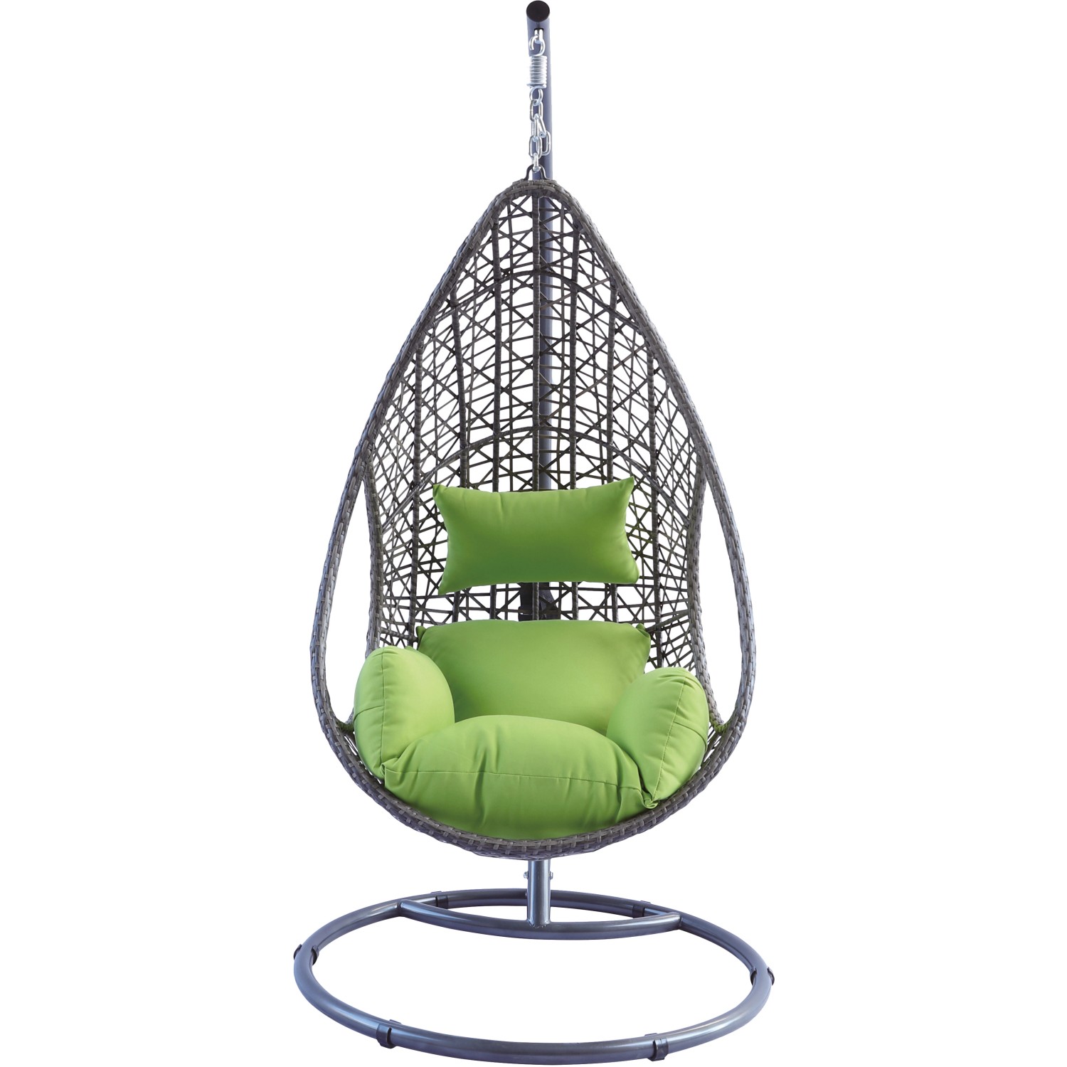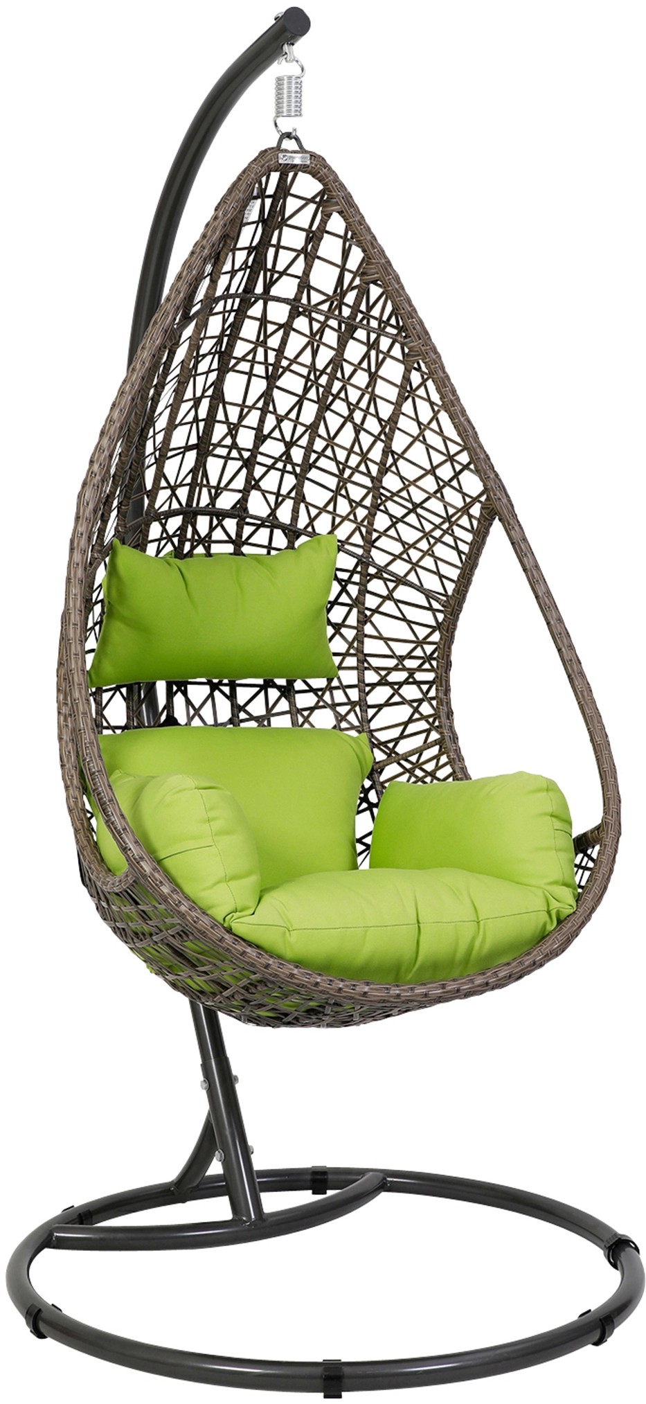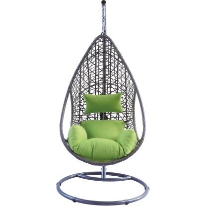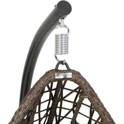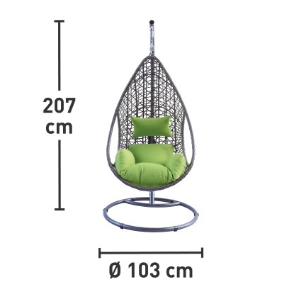 A függőfotel időjárásálló és könnyen ápolható barna polirattan fonással borított. A hozzáillő zöld párnák kiegészítik a tetszetős összképet, és extra kényelemről gondoskodnak. A csomag tartalmazza az ülő- és fejpárnát. A huzatok 100% poliészterből állnak, a töltelék 8 cm vastag habanyagból készült.