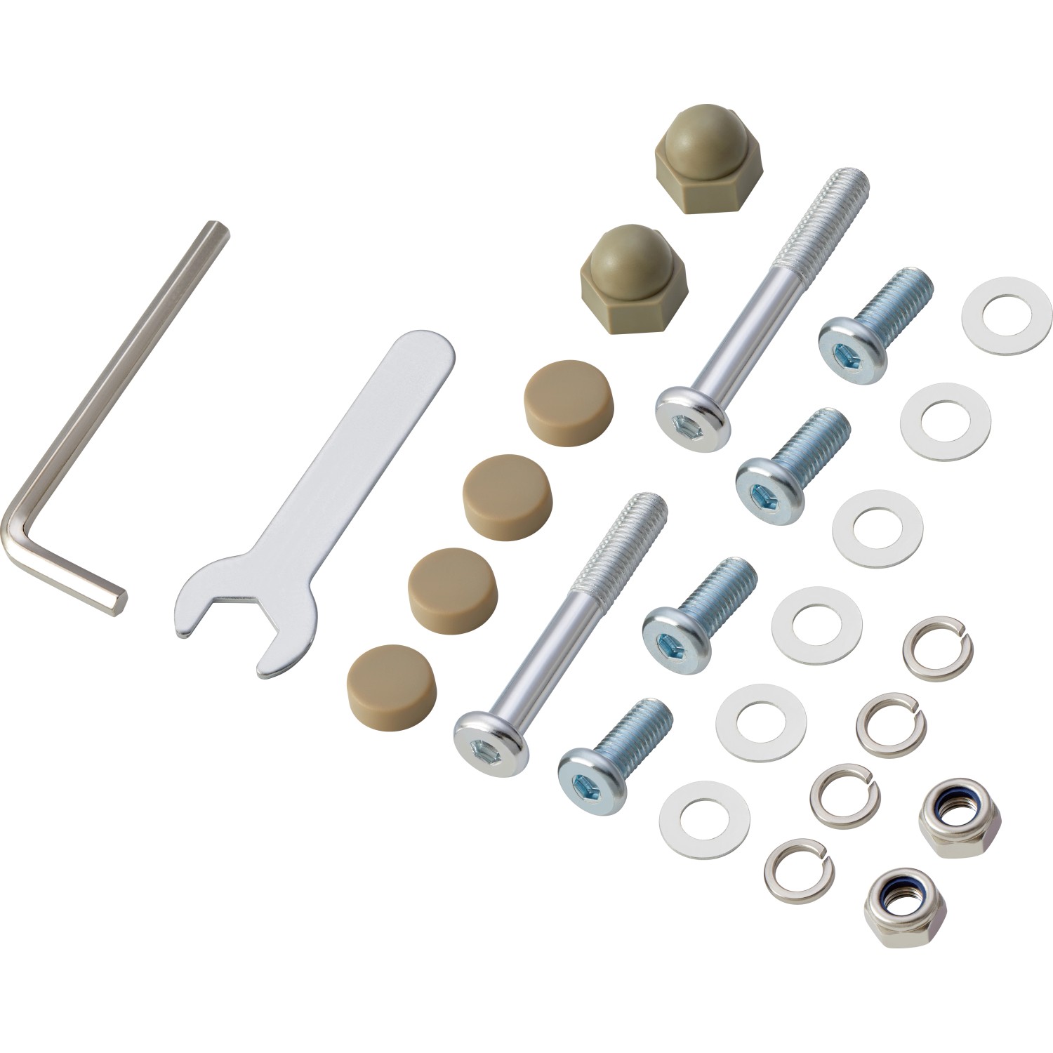 A 26 részes szerelőkészlet a Palmwoods acél függőfotel szilárd felállításásra szolgál. Megbízhatóan összeköti az ülőkosarat a vázzal, és lehetővé teszi a biztonságos használatot. A rögzítőkészlet rozsdamentes acélból készült csavarokat, alátéteket, rugós gyűrűket és ellenanyákat tartalmaz. Továbbá a világosbarna műanyagból készült takarósapkákat is tartalmazza. Azért, hogy az összeszerelés gyorsan és egyszerűen menjen, a szállítási csomag tartalmazza a megfelelő szerszámot.
