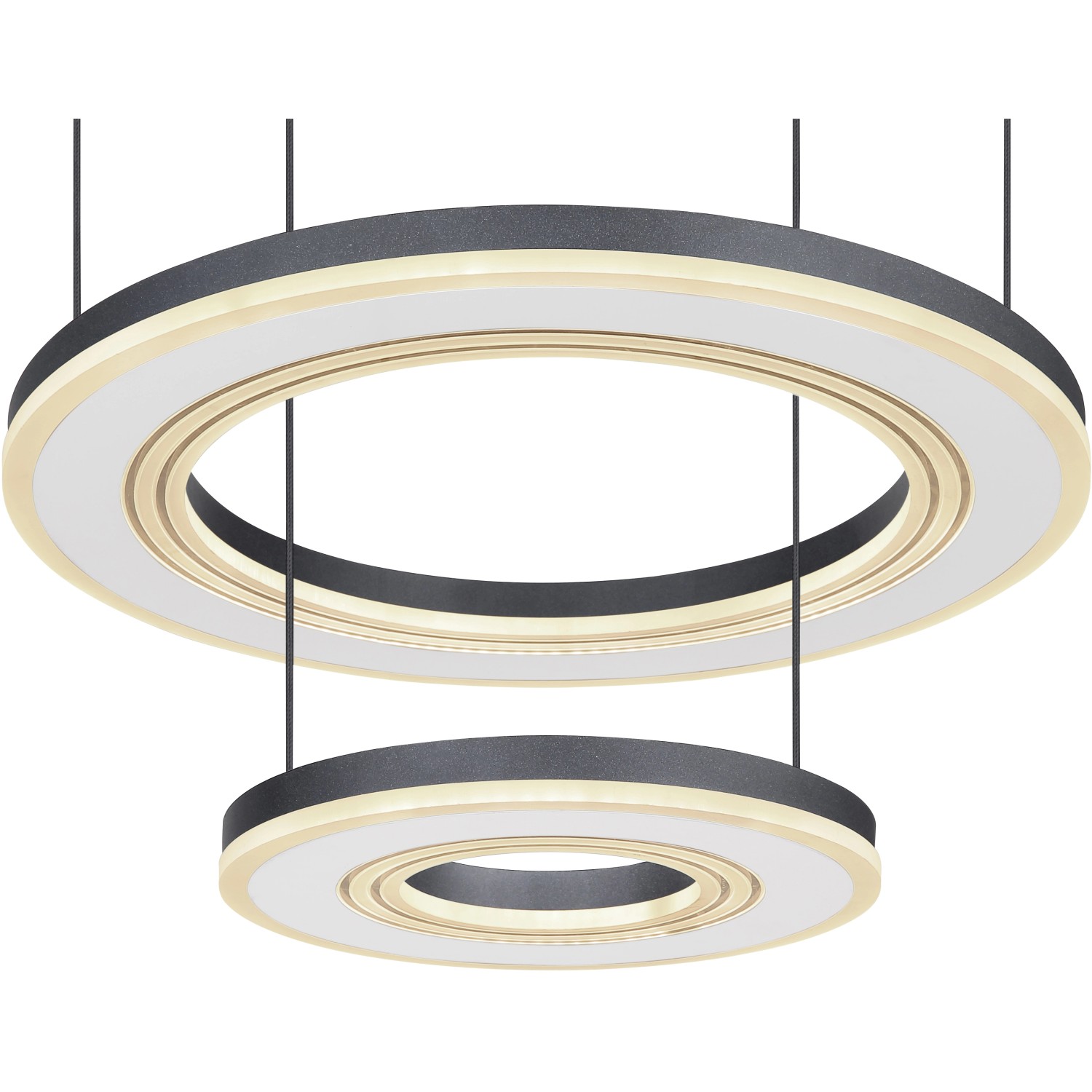 A Blasius termékcsalád kerek függőlámpája (50 cm átmérő) gyönyörű kiegészítője a belső tereknek. Két különböző méretű, felül fekete és alul fehér fémgyűrűből áll, amelyek két-két fekete kábelen lógnak a mennyezetről, és opálos akrillal díszítettek.