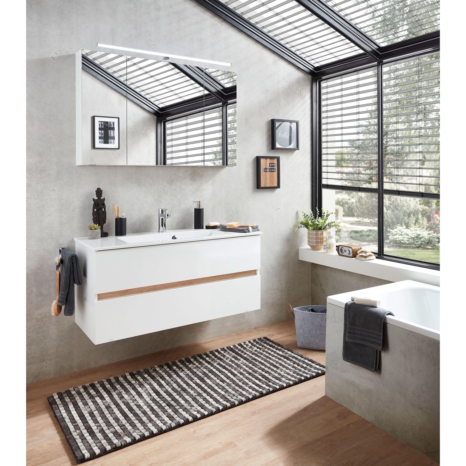 A mosdó alatti szekrény rengeteg tárolóhelyet kínál, miközben elrejti a szabadon lévő csöveket. Mindez vizuálisan feldobja a mosdókagylót. Az ásványi márvány mosdókagyló nagy tárolófelületével, valamint karc- és foltállóságával nyűgöz le.Tükrös szekrény LED-es világítással