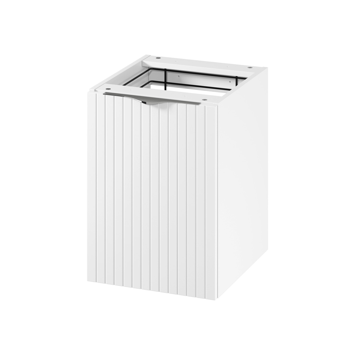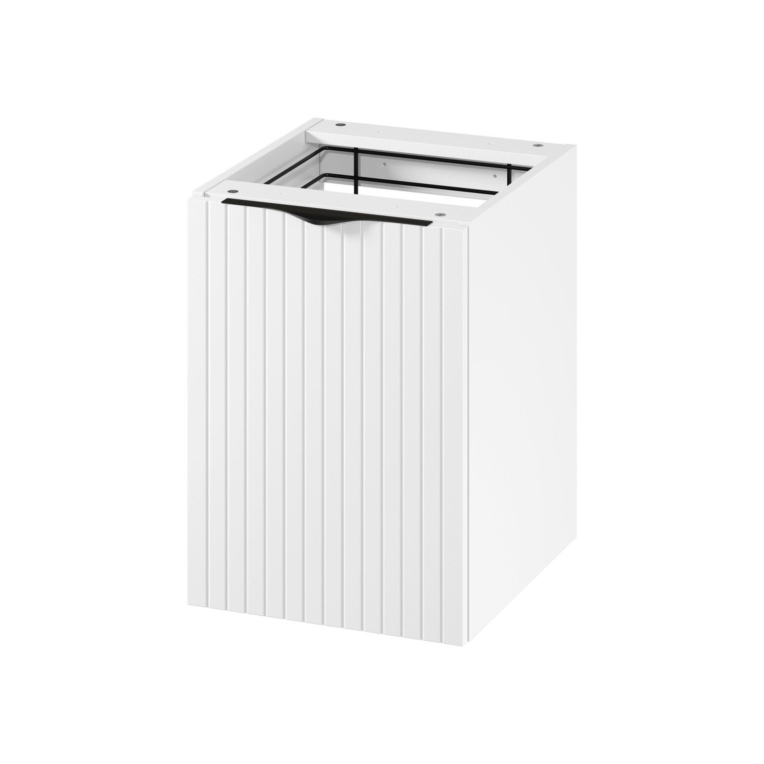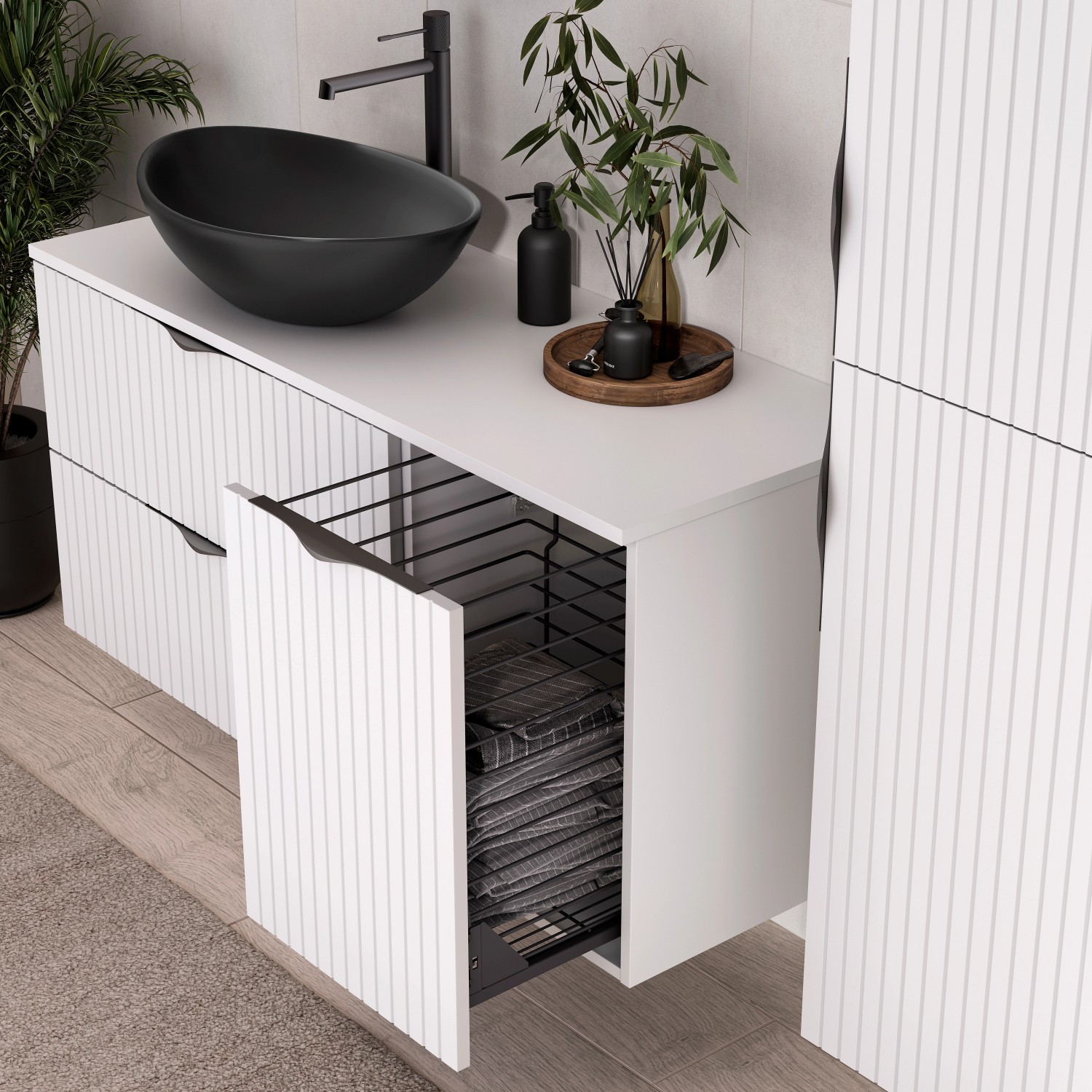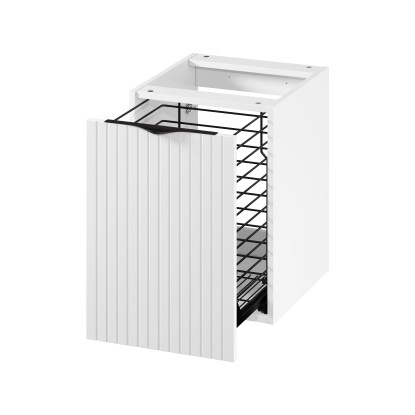 A szennyestartóval ellátott pult alatti szekrény praktikus és esztétikus megoldás bármilyen fürdőszobába. A szennyestartó lehetővé teszi a ruhák egyszerű és hozzáférhető rendszerezését. A lágyan záródó mechanizmus garantálja a csendes és sima ajtózáródást, ami növeli a használat kényelmét. A szekrény eleje matt bevonatú, hornyolt MDF lapból készült, ami elegáns megjelenést kölcsönöz neki, a matt bevonatú laminált forgácslapból készült test pedig tartósságot és könnyű tisztíthatóságot biztosít. Ezenkívül a termék két fém fogantyúkészletet (fekete és króm) is tartalmaz, amelyek lehetővé teszik a szekrény megjelenésének a felhasználó igényeihez igazítását. A szekrény tökéletesen illeszkedik a munkalapokhoz, így tökéletes kiegészítője bármilyen fürdőszobai berendezésnek, ötvözve a funkcionalitást a modern dizájnnal.