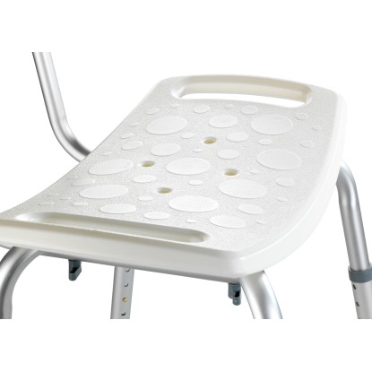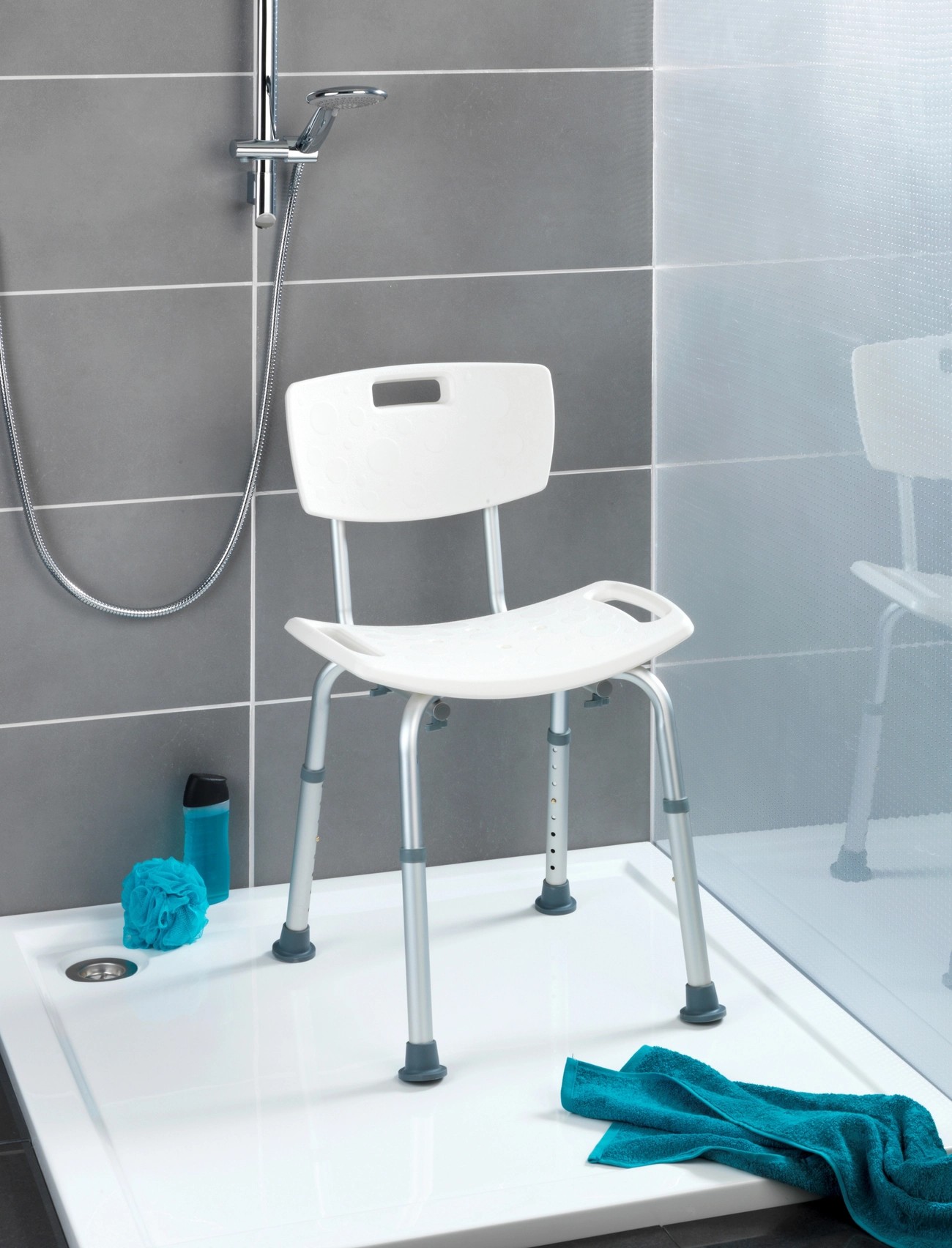 A stabil Secure háttámlás fürdőszobai szék gondoskodik a nagyobb fürdési élvezetről és biztonságról, mivel a kényelmes ülésmagasító megkönnyíti a fürdést és a zuhanyzást. A négy stabil, alumíniumból készült, gumikupakkal ellátott lábnak köszönhetően a praktikus szék mindig biztonságosan áll a padlón. A kényelmes ülés és háttámla kiváló minőségű, fehér műanyagból készült. Ez ülés emellett hatékony fogantyúkkal van ellátva. Az ülés 8 magasságba állítható, 35,5 cm - 52,5 cm között. Szükség esetén a háttámla eltávolítható. A TÜV/GS tesztelt zuhanyszék maximális teherbírása 130 kg.