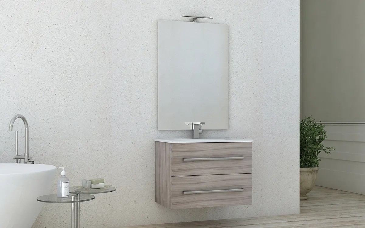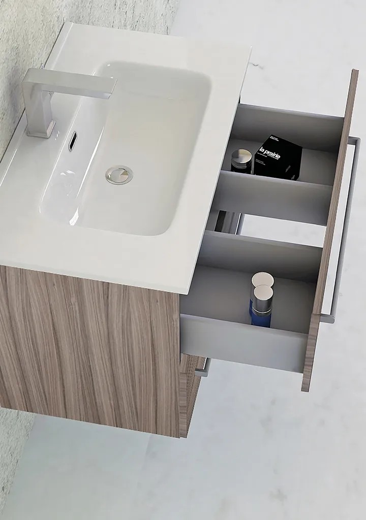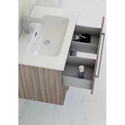 Mosdó alsószekrény. Az ajtó becsapódásgátlóval felszerelt. Készre szerelt. Vörösfenyő színben.