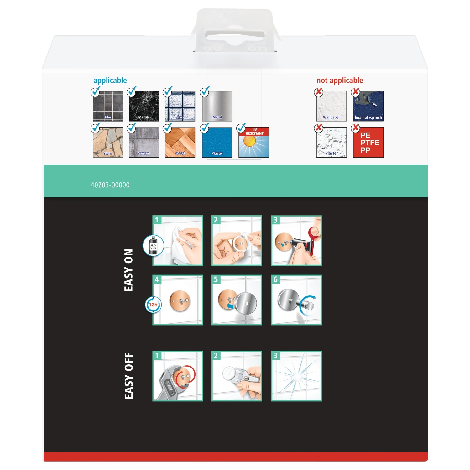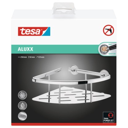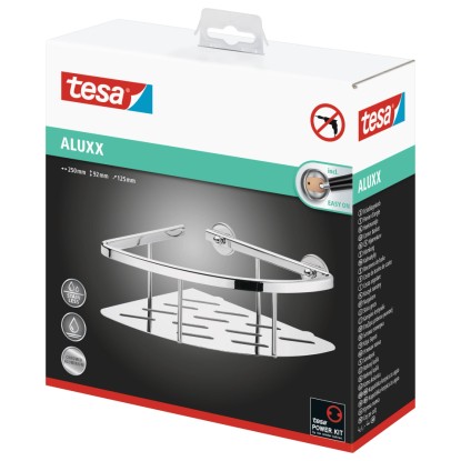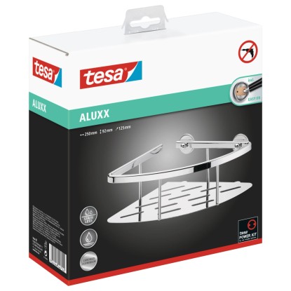 A tesa ALUXX sarok zuhanypolc gyönyörű kiegészítő, melyen a zuhanyzóban szükséges tárgyakat könnyen elérhető helyen tarthatja. Magasfényű, krómozott alumíniumból készült, alsó lemezéről a szappan és a víz könnyen le tud folyni. A ragasztós rögzítési megoldásnak köszönhetően, melynek 12 órára van szükség a megkötéshez, a sarokpolc tetszés szerint a legalkalmasabb helyre helyezhető. Nincs szükség fúrásra, a fal és a csempe nem sérül. A kosár bármikor gyorsan, nyom nélkül le is vehető. A sarok-zuhanypolc egy új BK43-2 adapterrel kényelmesen újra felszerelhető egy másik helyre.
