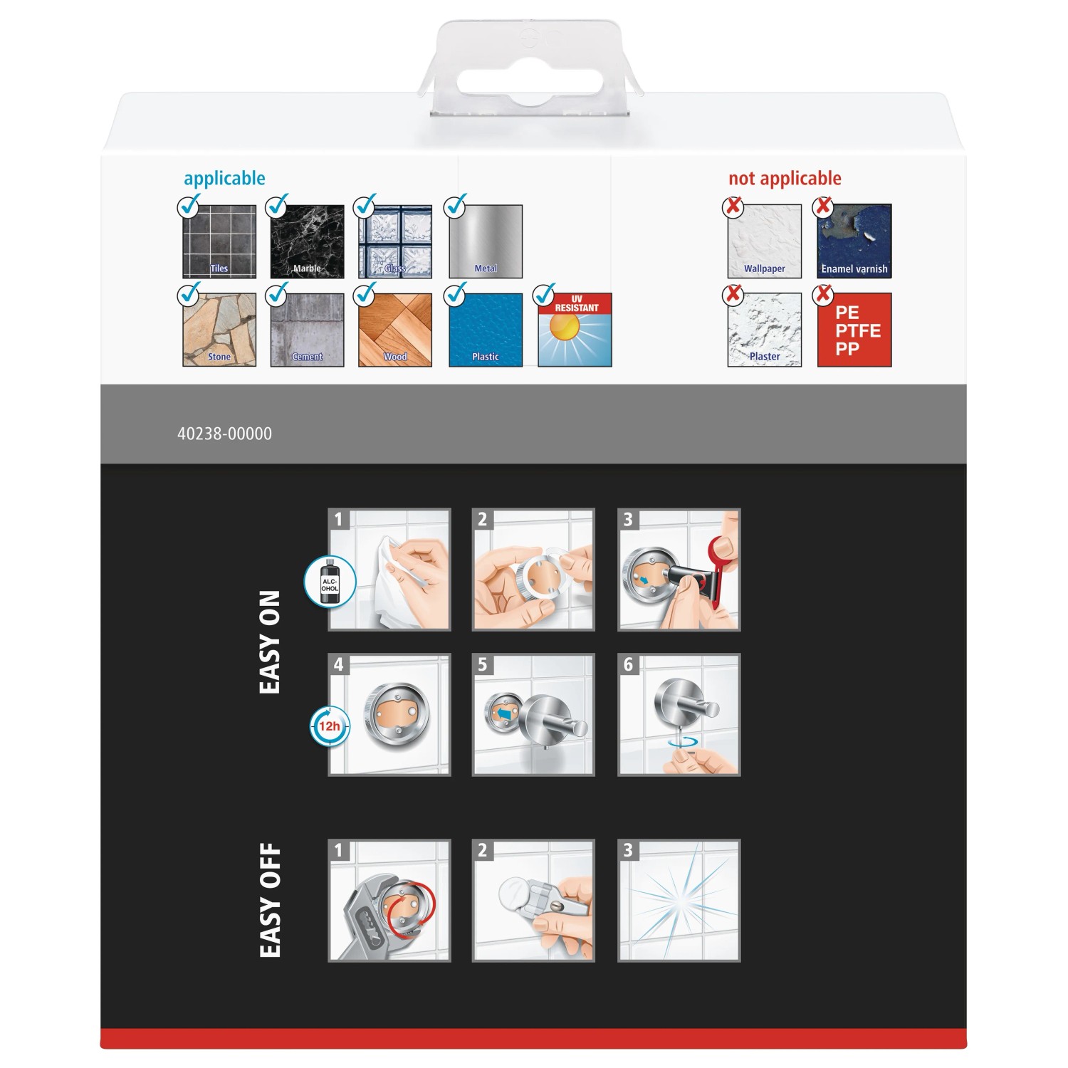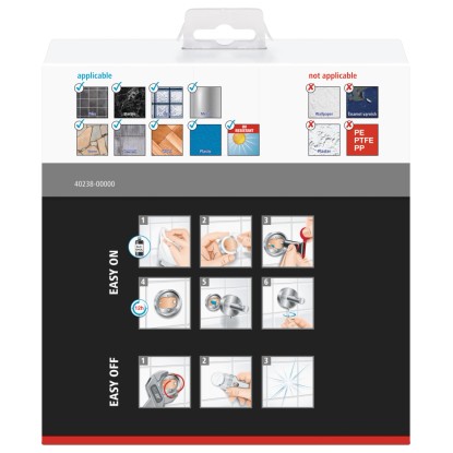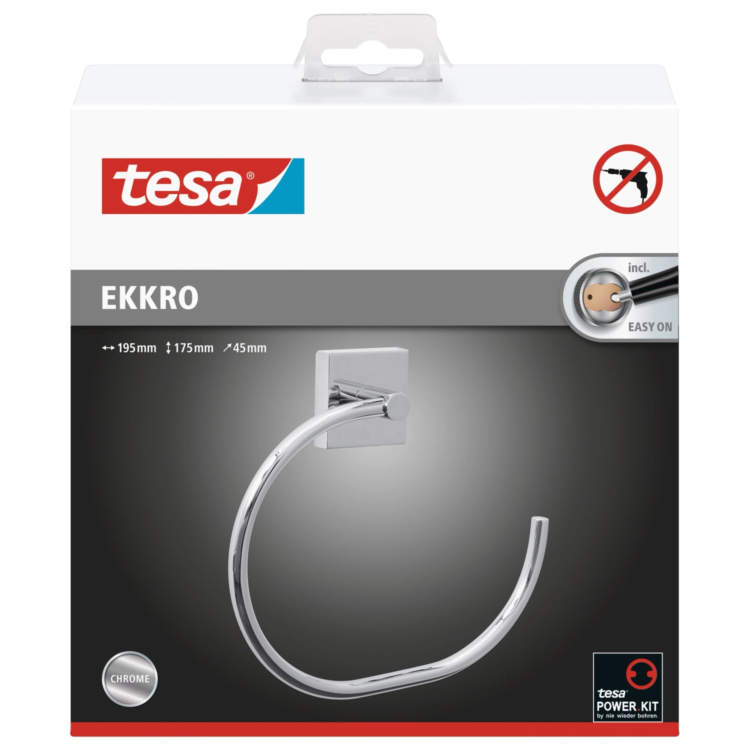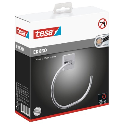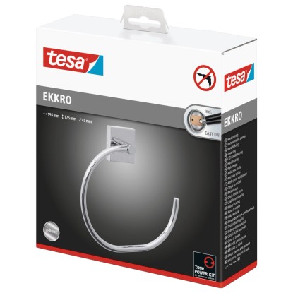 A törölközőket rendszerint akasztókra vagy rudakra akasztják, de a tesa® EKKRO törölközőtartó gyűrű magasfényű, lekerekített formájával és szögletes konzoljával kitűnik ezek közül. A törölközőtartó további előnye, hogy öntapadós kialakításának köszönhetően fúrás nélkül rögzíthető, így a felületen nem keletkeznek furatok vagy más sérülések. A ragasztó a 12 órás kötési idő után nagyon stabilan megköt, és hosszú időn át biztosan tartja a törölközőket. Ugyanakkor a gyűrűt visszamaradó nyomok nélkül, gond nélkül le lehet venni, és egy új BK20 adapterrel újra felhasználható egy másik helyen.