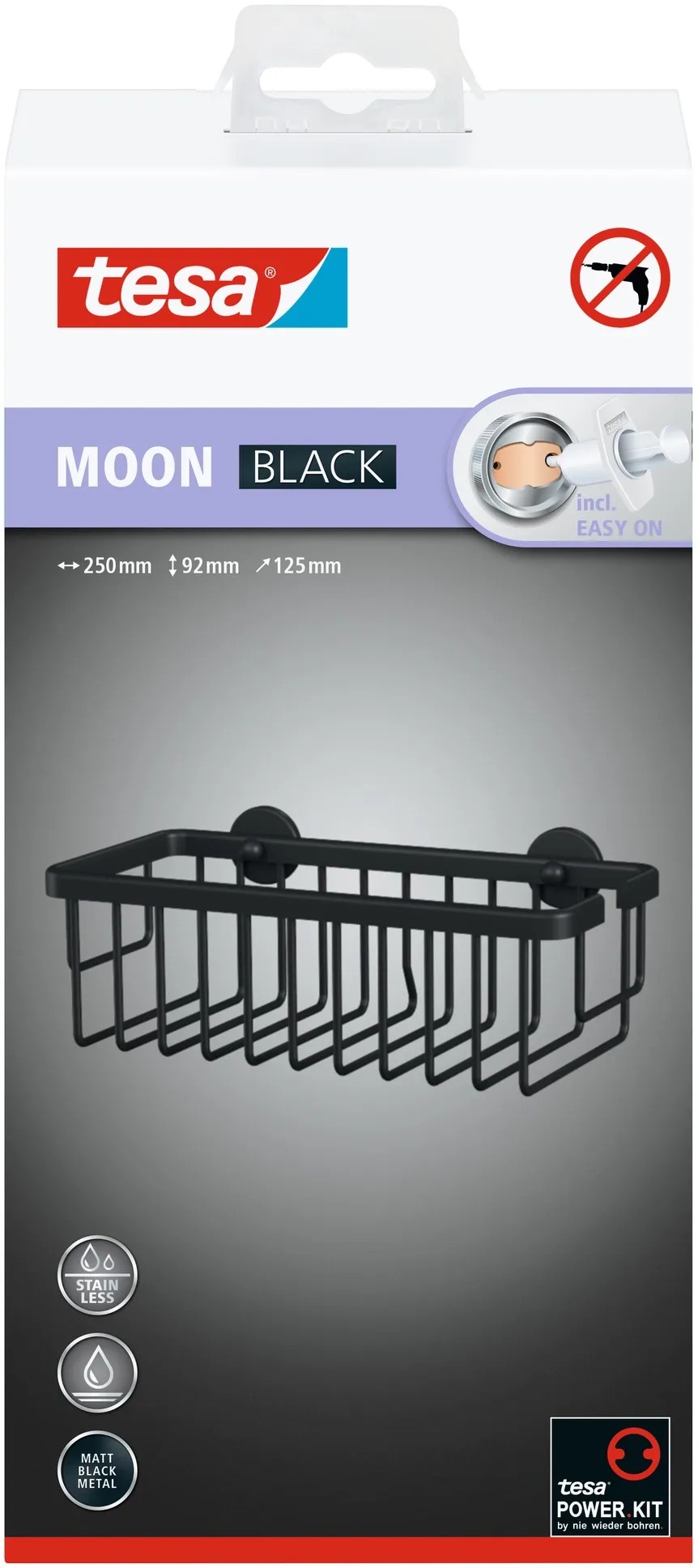 Rendrakás stílusosan: A fekete matt, felragasztható tesa Moon Black zuhanykosárnak köszönhetően a fürdőszobai használati tárgyaknak, például a tusfürdőknek vagy a samponoknak, végre állandó helyük lesz a fürdőszobában. A matt fekete színű kialakítás tökéletesen illeszkedik az ipari stílusú, a scandi stílusú vagy a purista stílusú fürdőszobákhoz. A tesa ragasztási megoldásnak köszönhetően a felszerelés biztonságos és gyors - a falon vagy a csempén való fúrás és az ebből adódó szennyeződések nélkül. Szükség esetén a tartó nyom nélkül újra eltávolítható - tiszta és egyszerű. Tesa.Power.Kit Glue: Figyelem. Használatkor veszélyes, belélegezhető por képződhet. A port nem szabad belélegezni.