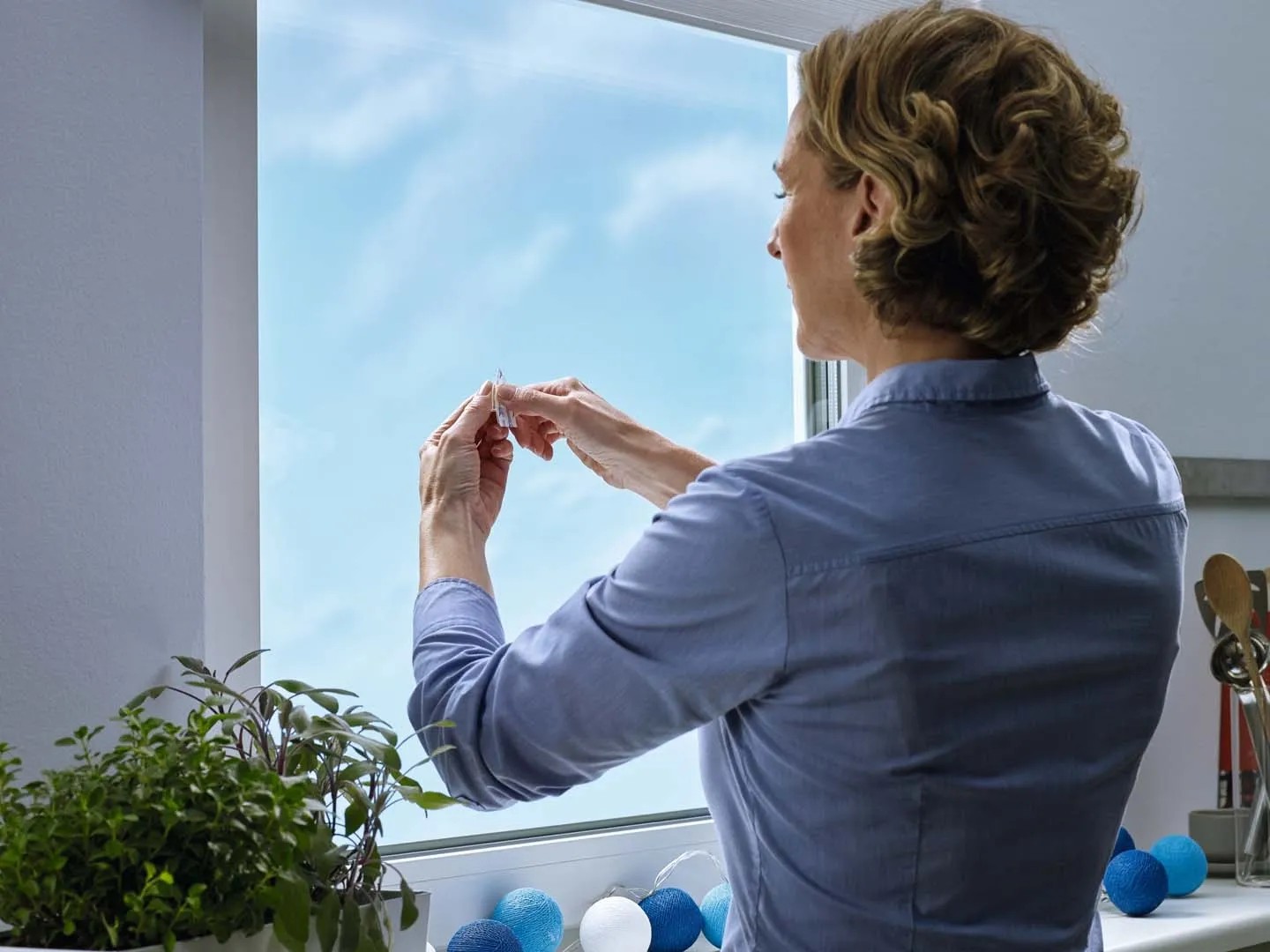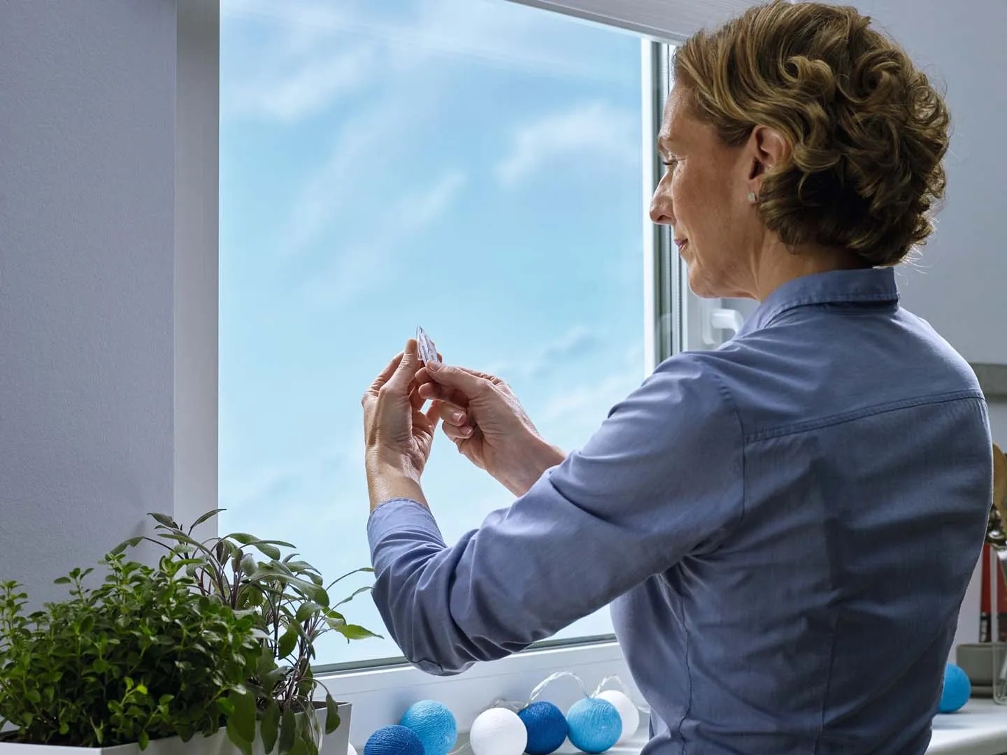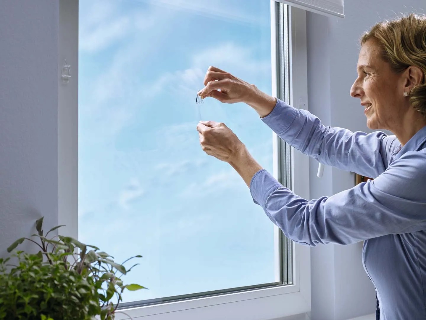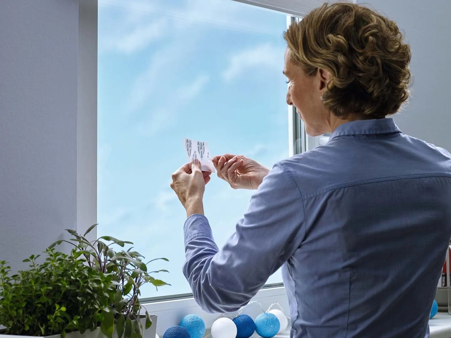 2. Ezután vegye le a ragasztócsíkot a hátlapjáról, és helyezze fel függőlegesen az üvegre vagy átlátszó felületre. Nyomja rá öt másodpercig.