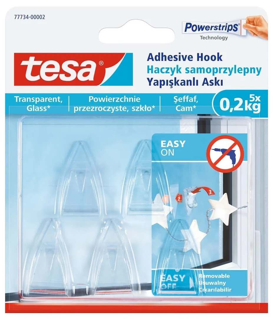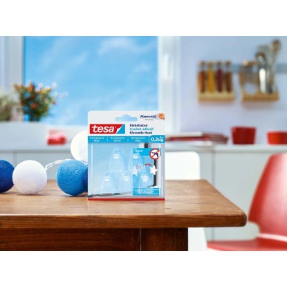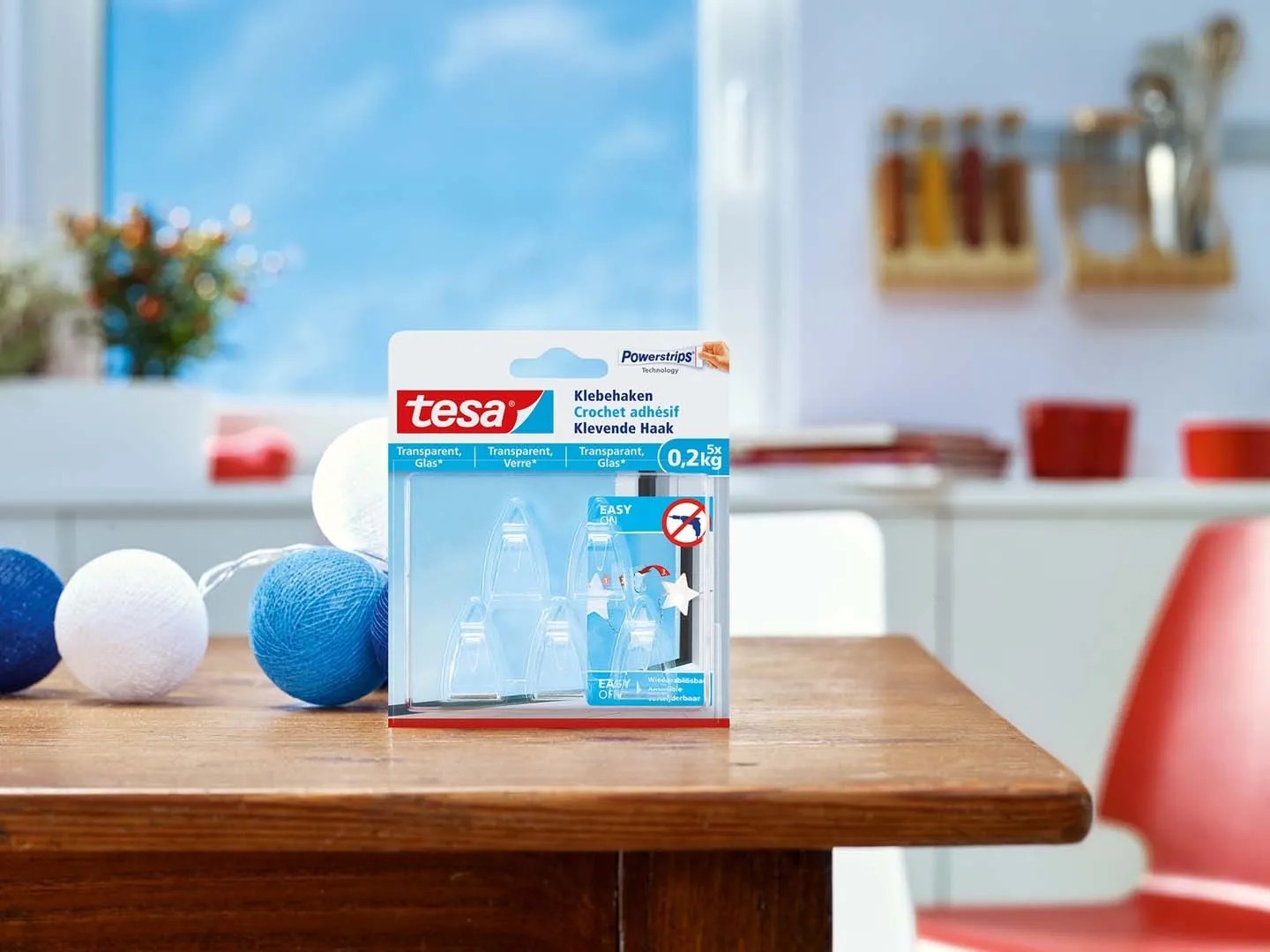 A tesa átlátszó felületeken és üvegen használható, 0,2 kg teherbírású öntapadós akasztói szinte láthatatlan módszert kínálnak dekorációk és kis tárgyak rögzítésére a lakás bármely pontján. Az öntapadós akasztók nyom nélkül eltávolíthatók, és 0,2 kg súlyig tartanak.