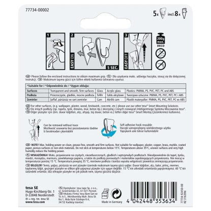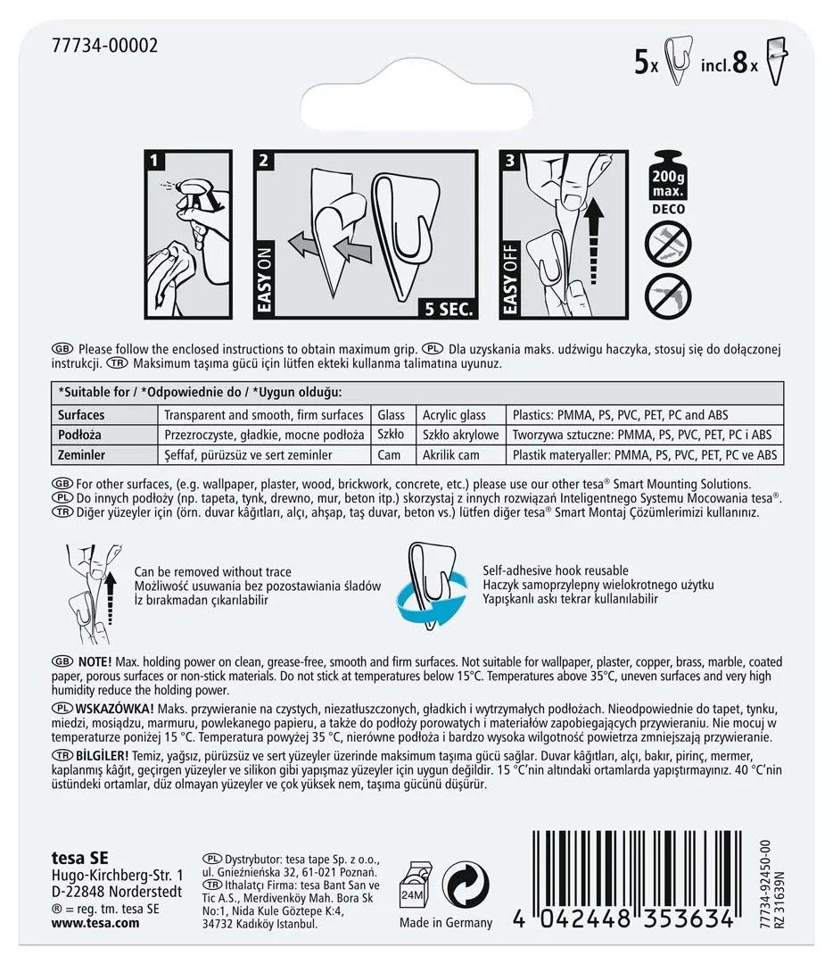 A Tesa átlátszó felületeken és üvegen használható öntapadós akasztói a pénztárcáján túl a környezetet is kímélik, mivel az öntapadós akasztókat újra és újra fel lehet használni. Nem kell mást tennie, mint beszerezni a Tesa átlátszó felületeken és üvegen használható, 0,2 kg teherbírású ragasztócsíkjait tartalmazó pótkészletet a Tesa innovatív rögzítési rendszerének forgalmazójától.