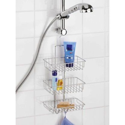 A 3 szép drót tárolókosár - a tusfürdőnek, a szappannak vagy a szivacsoknak -, valamint a 2 akasztó - a mosdókesztyűknek - révén mindig minden kéznél van.
