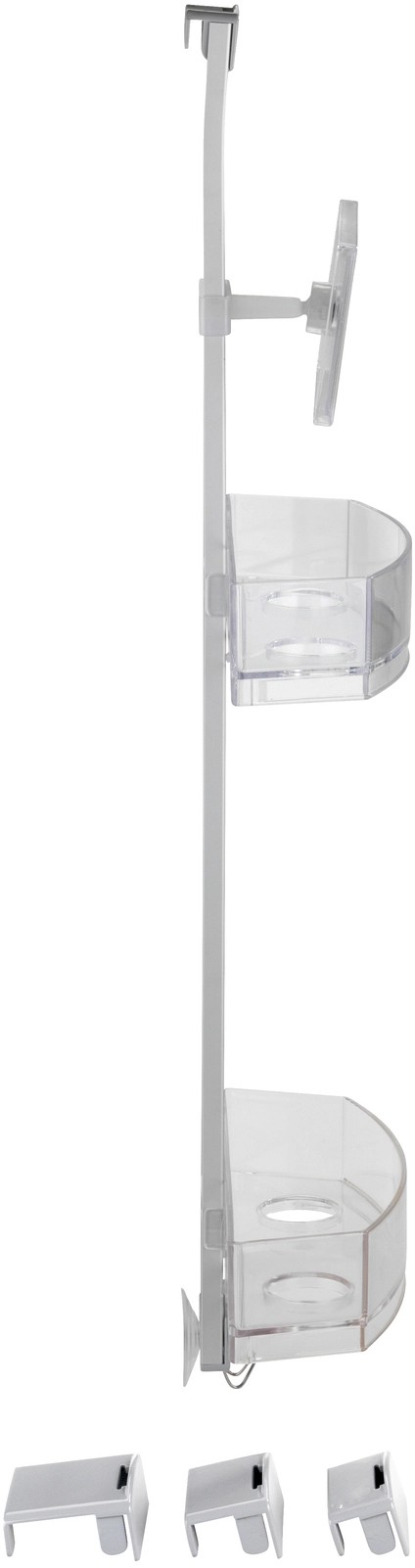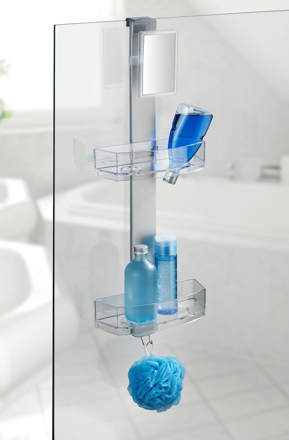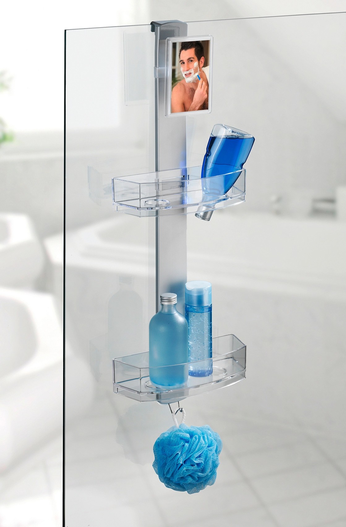 A kiváló minőségű zuhanypolc mind beakasztásra, mind falra szerelésre alkalmas. Ezenkívül egy praktikus páramentes tükörrel is rendelkezik. A zuhanypolc egy rozsdamentes acél rúdból, két műanyag polcból és egy rozsdamentes acél akasztóból áll. Modern formatervezés és nagy fokú funkcionalitás jellemzi, és a zuhanyfülkében, az ajtón vagy a teljes fürdőszobában bárhol használható.