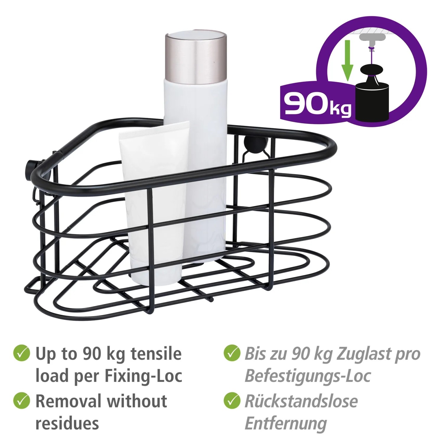 A Wenko fekete színű Trestina rozsdamentes acél sarokpolca ideális helyet kínál a fürdőszobai eszközöknek és kozmetikumoknak. Az extra mély kosár biztonságos helyet biztosít például a sampon- vagy tusfürdőpalackok számára, és kompatibilis az egyedülálló UV-Loc ragasztórendszerünkkel.