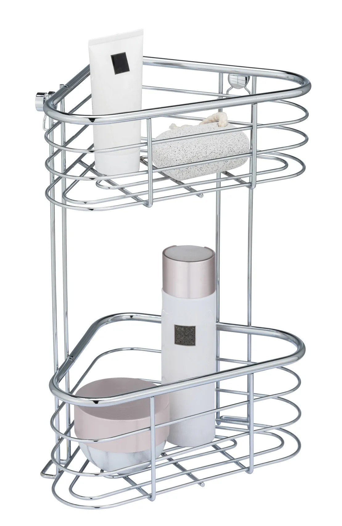 A kiváló minőségű Trestina sarokpolc vizuálisan és praktikusan is alkalmas a fürdőszobában való használatra. A palackokban vagy tubusokban tárolt kozmetikumok elegánsan tárolhatók. Két kosárban kiválóan rendezheti termékeit - akár tulajdonos, akár termékkategória szerint. Különösen a zuhanyzóban helyezhetők el megfelelően a samponok és tusfürdők a kívánt magasságban.