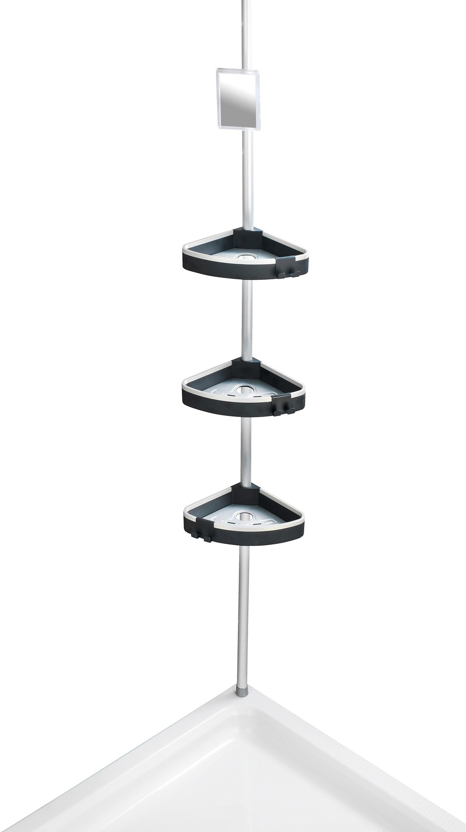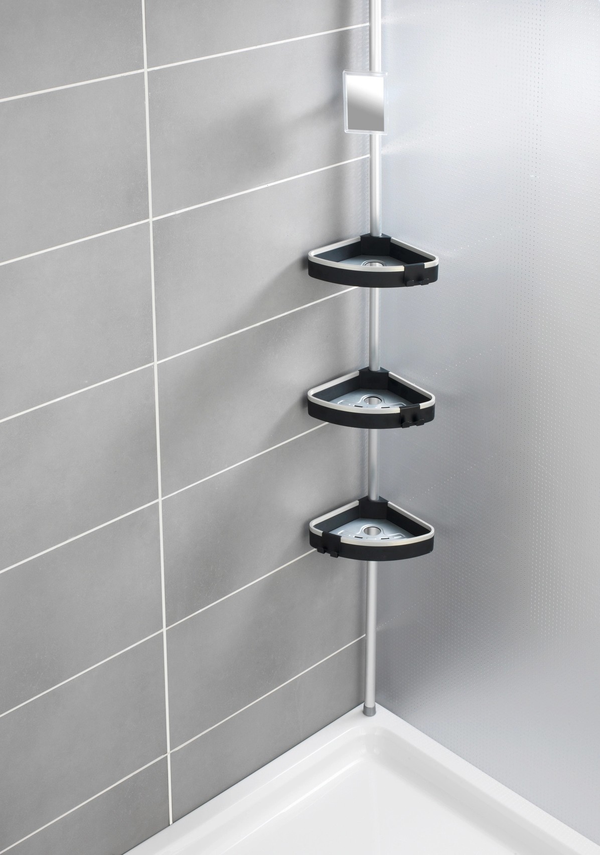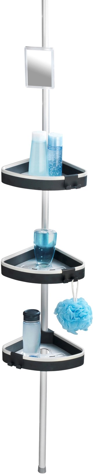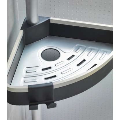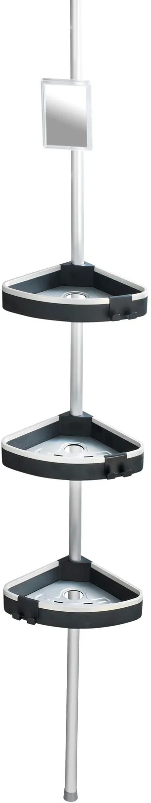 A zuhanypolcot az integrált páramentes tükör teszi teljessé. A páramentes tulajdonságnak köszönhetően az üvegfelületen nem tud létrejönni kondenzvízből adódó kicsapódás, így mindig látja magát a tükörben. Ez rendkívüli módon megkönnyíti a zuhany alatti borotválkozást. A rozsdamentes, alumíniumból készült teleszkópos rúdnak köszönhetően a polcok magassága tetszés szerint állítható 70 cm és 260 cm között. A polc univerzálisan használható a zuhanyfülkében, a fürdőkád sarkában vagy a fürdőszobában. A praktikus sarokpolc egy pillanat alatt felszerelhető: egyszerűen szorítsa a padló és a mennyezet közé, és kész is, mindenfajta fúrás és csavarozás nélkül.