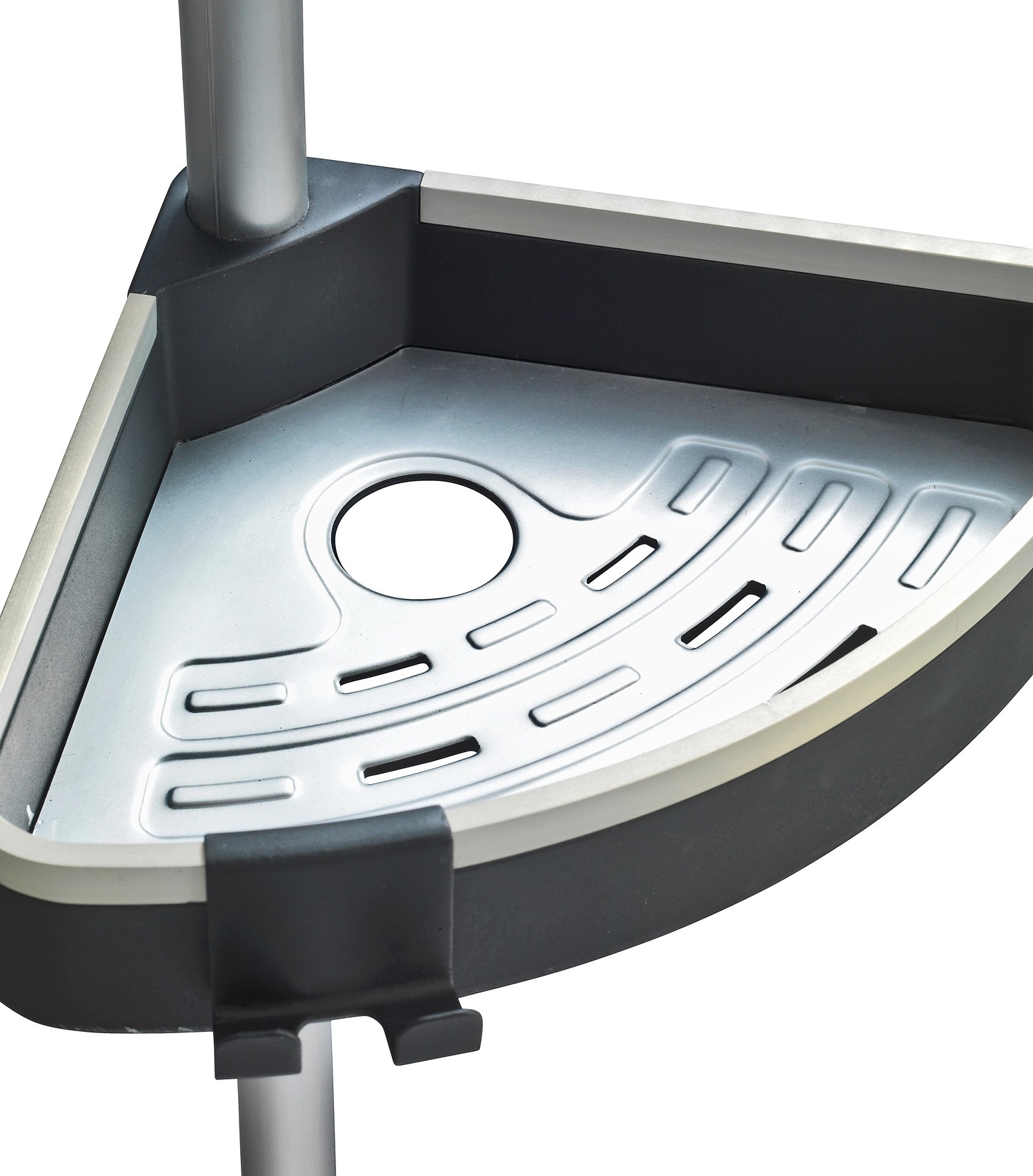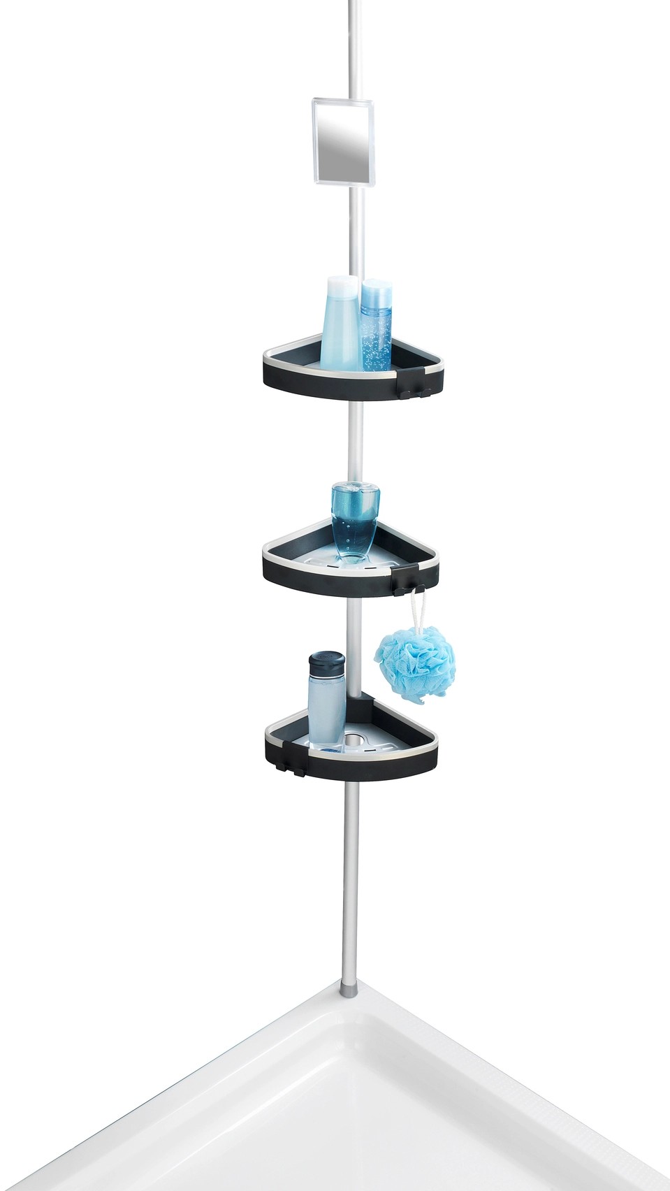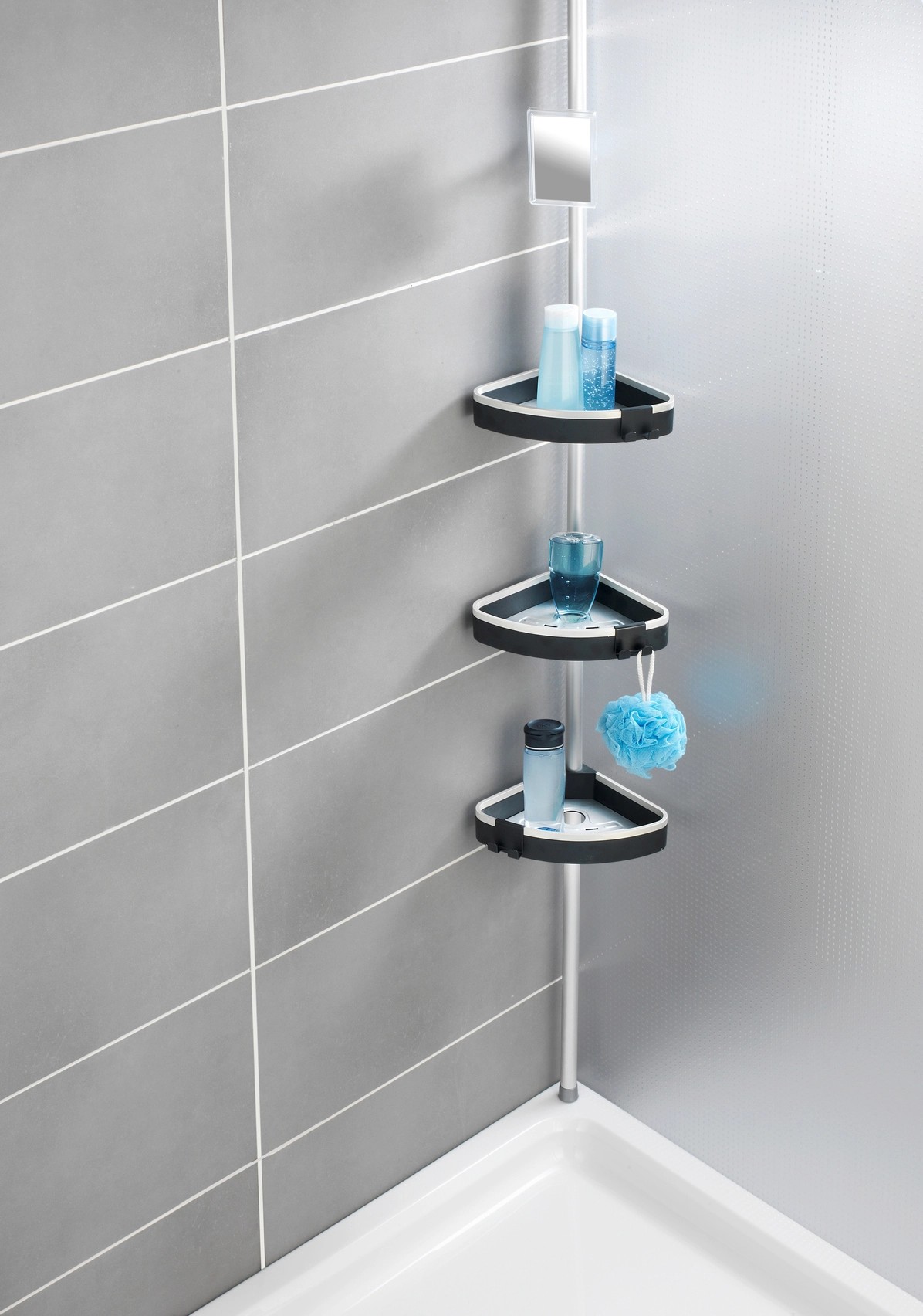 A zuhanypolcot az integrált páramentes tükör teszi teljessé. A páramentes tulajdonságnak köszönhetően az üvegfelületen nem tud létrejönni kondenzvízből adódó kicsapódás, így mindig látja magát a tükörben. Ez rendkívüli módon megkönnyíti a zuhany alatti borotválkozást. A rozsdamentes, alumíniumból készült teleszkópos rúdnak köszönhetően a polcok magassága tetszés szerint állítható 70 cm és 260 cm között. A polc univerzálisan használható a zuhanyfülkében, a fürdőkád sarkában vagy a fürdőszobában. A praktikus sarokpolc egy pillanat alatt felszerelhető: egyszerűen szorítsa a padló és a mennyezet közé, és kész is, mindenfajta fúrás és csavarozás nélkül.