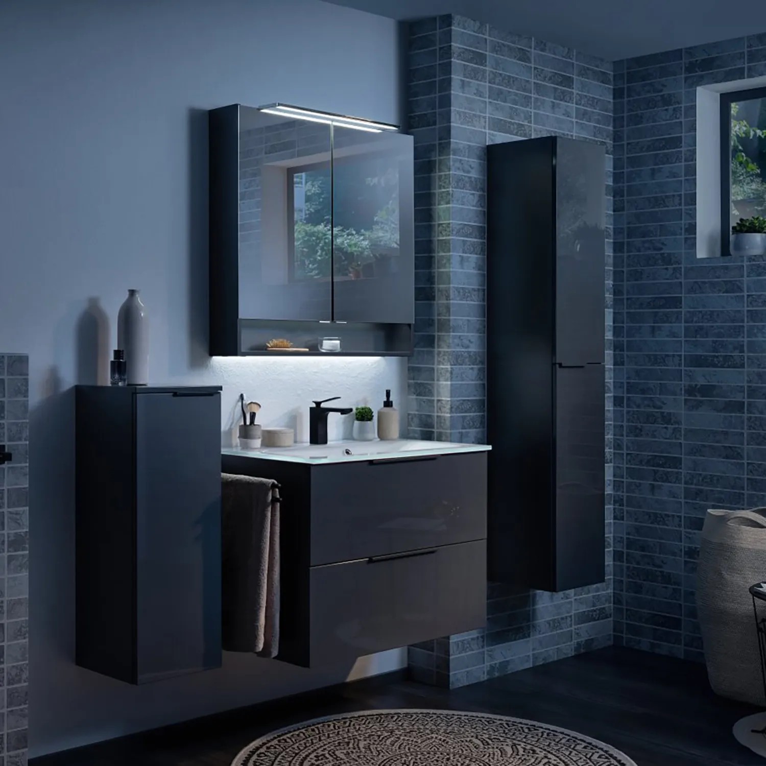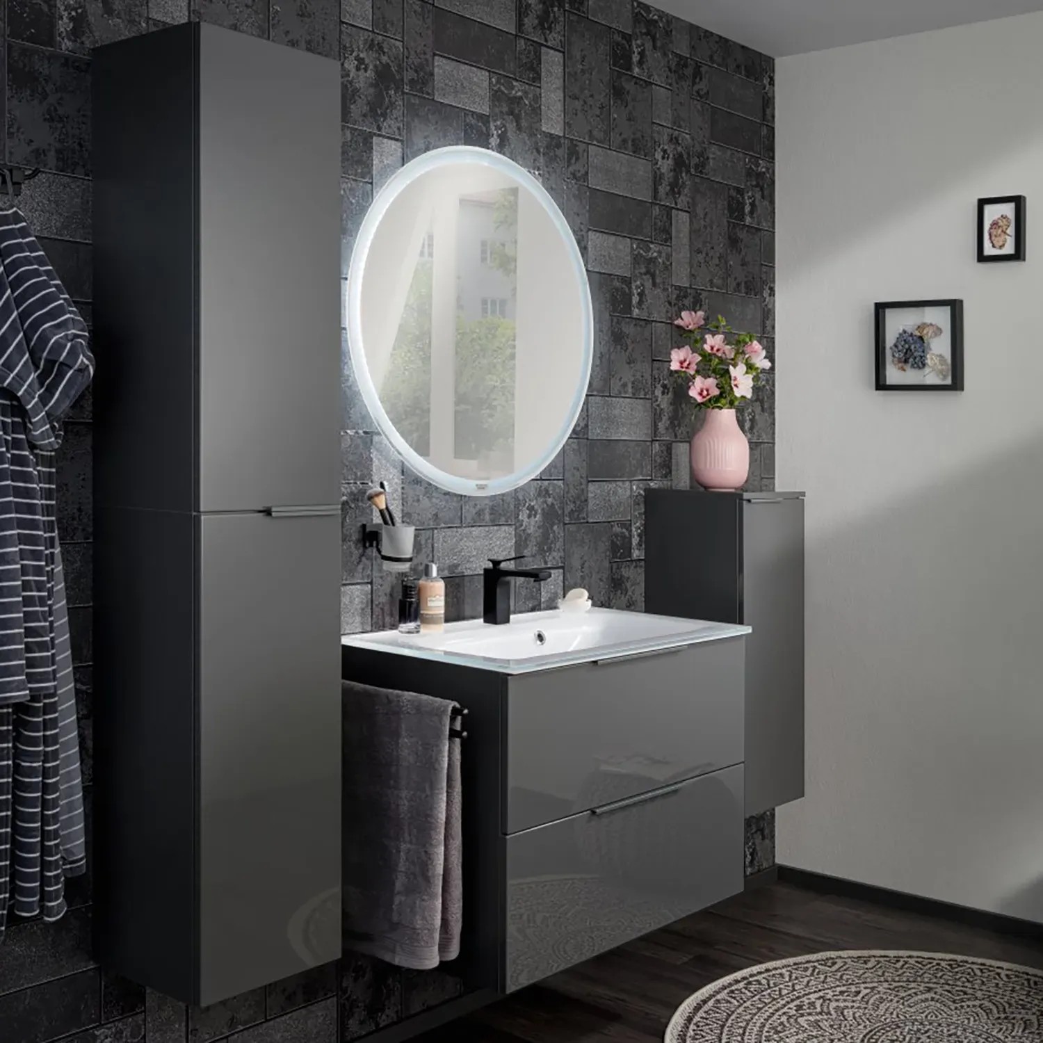 A modern ipari stílus és az időtlen antracit szín kombinációja igazi szemet gyönyörködtető látványt nyújt minden fürdőszobában. Az előlap magasfényű felülete és a matt korpusz nemcsak könnyen tisztítható, hanem kihangsúlyozzák a szekrény elegáns megjelenését.