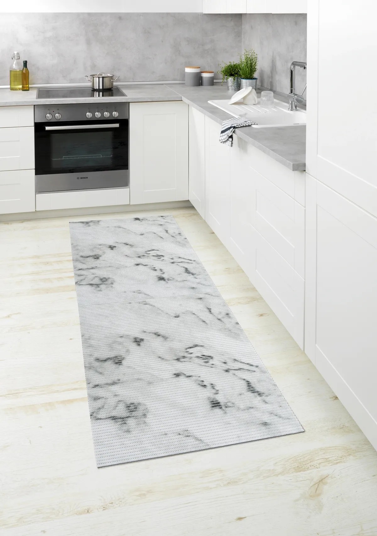 A Wenko praktikus, puha habszivacsból készült szőnyegével egy igazi univerzális kiegészítő érkezik otthonába. Az ötletes, könnyen ápolható műanyagból készült szőnyeg igazi multifunkciós megoldás, és kifinomult márványos mintával rendelkezik. Kiválóan használható a fürdőszobában a fürdőkád vagy a zuhanyzó előtt. Csúszásgátló hatású, és minden olyan helyen gondoskodik a szükséges biztonságról, ahol nedves lehet a padló. Konyhai szőnyegként is kiválóan mutat. Kültéren, az erkélyen vagy a teraszon elhelyezve a szőnyeg dekoratív és kiváló ellenálló képességgel rendelkező látványosság lesz. Fitneszhelyiségekben vagy szaunák környezetében is tökéletes padlóburkolatnak bizonyul. A puha hab nagyon kényelmes érzetet kelt a lábak számára. Emellett a szőnyeg nagyon higiénikus, légáteresztő, és padlófűtés esetén is használható. A rugalmasan kezelhető szőnyeg ollóval kényelmesen a kívánt méretre vágható. A kényelmes szőnyeg szennytaszító tulajdonsággal rendelkezik, és szükség esetén legfeljebb 40 Celsius-fokos kímélő programon mosható mosógépben. Mérete (Sz x Mé): 65 cm x 200 cm