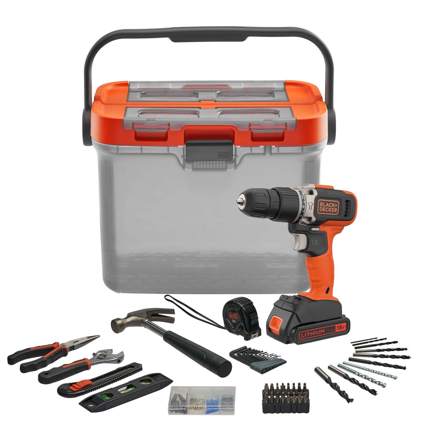 Csomag tartalma: 12 imbuszkulcs, 33 csavarozóhegy, 10 fúrószár, 1 képakasztó készlet, 1 kalapács, 1 mérőszalat, 1 vízszintmérő, 1 fogó, 1 vágókés, 1 állítható csavarkulcs
