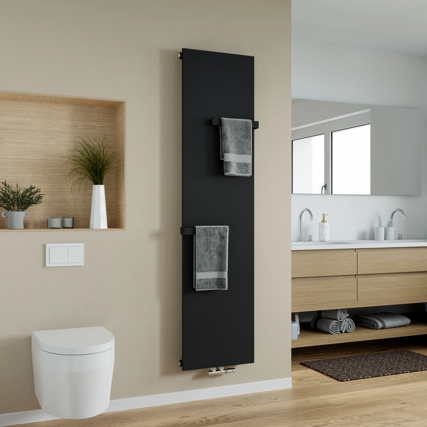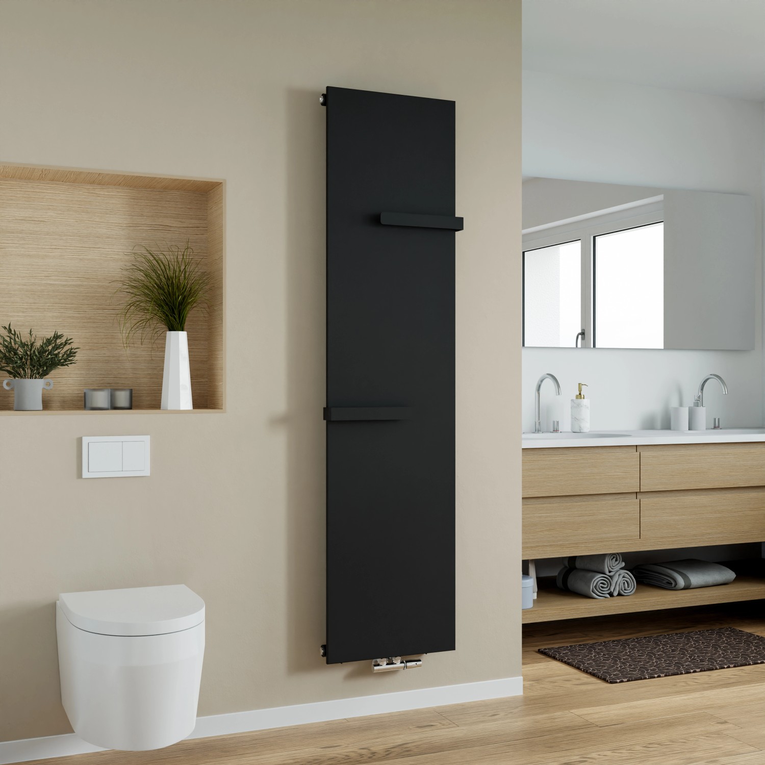 A Molly törölközőszárító elegáns formatervet és funkcionális felszereltséget kínál. Sima felülete és 50 mm-es középső csatlakozója modern megjelenést kölcsönöz neki és egyszerű felszerelést tesz lehetővé. A fűtőtest emellett két praktikus törölközőtartóval is rendelkezik. A minőségi, hidegen hengerelt, porfestett acélból készült törölközőszárító radiátor nemcsak hosszú élettartamú, de a felülete is könnyen tisztítható. A Molly törölközőszárító radiátor minden szokványos központi fűtéshez alkalmas és hatékony hőelosztást biztosít. Ideális minden fürdőszobába, amely egyesíti a kényelmet és a modern formatervet.