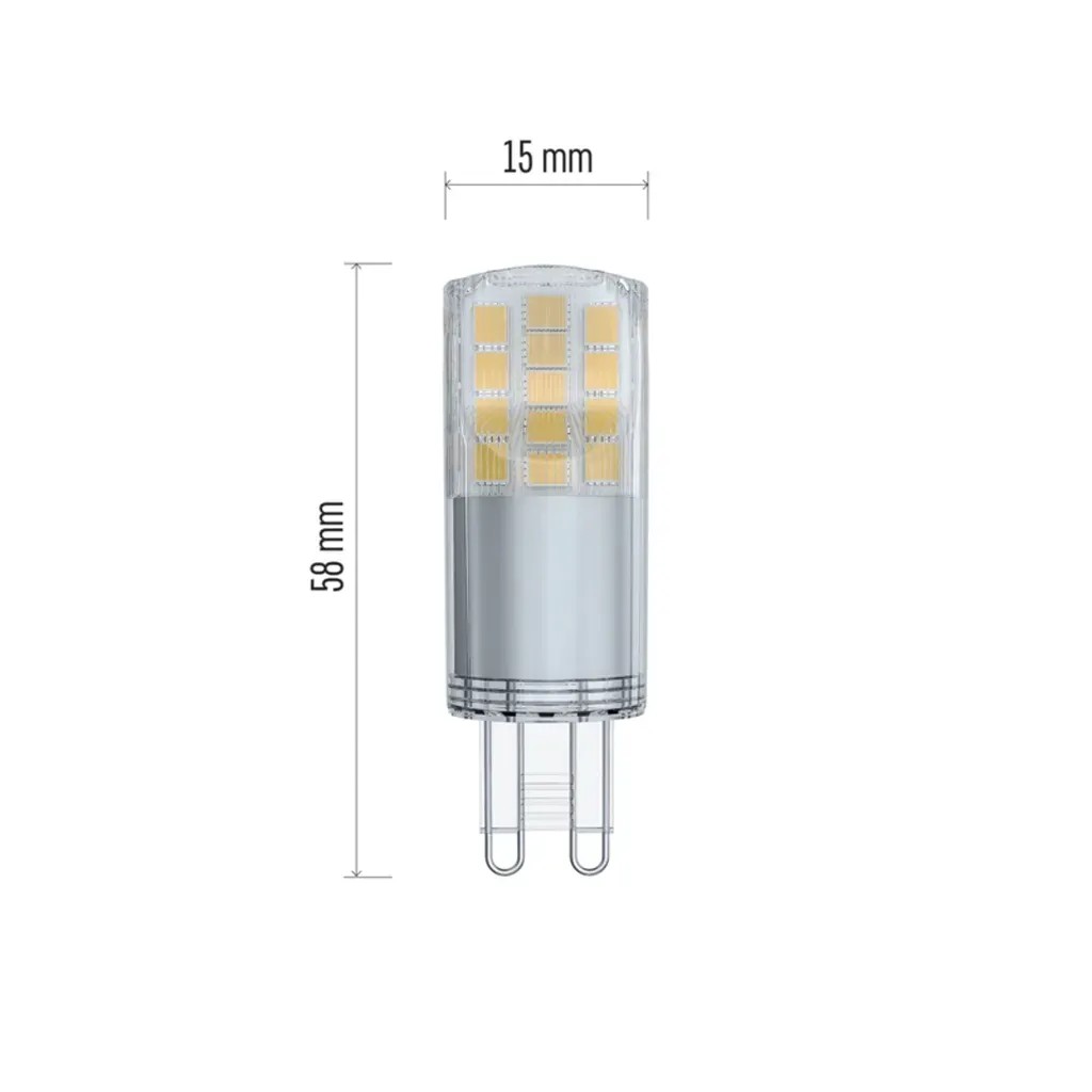 Technológia: LED. Foglalat: G9. Fény színe: meleg fehér. Helyettesítő: 40 W. Forma: JC. Fényáram: 470 lm, színhőmérséklet: 3 000 K. Fogyasztás: 4,2 W. Sorozat: Classic. Fényhasznosítás: 112 lm/W. Sugárzási szög: 300 fok.