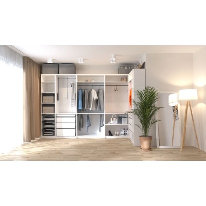 Hozza létre álmai gardróbját. Válassza ki a megfelelő elemeket (álló szekrények, polcok, fiókok, előlapok), és állítsa be a kiválasztott alakzatot. A moduláris bútorok tetszés szerint kombinálhatók vízszintesen és függőlegesen, a helyiség méretéhez és az Ön igényeihez igazodva. A márka könnyed és finom kollekciója kifinomultságot és eleganciát kölcsönöz a helyiségnek. A klasszikus színeknek és az időtlen dizájnnak köszönhetően a bútorok jól illeszkednek a modern és minimalista belső terekbe.