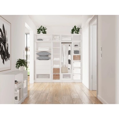 Hozza létre álmai gardróbját. Válassza ki a megfelelő elemeket (álló szekrények, polcok, fiókok, előlapok), és állítsa be a kiválasztott alakzatot. A moduláris bútorok tetszés szerint kombinálhatók vízszintesen és függőlegesen, a helyiség méretéhez és az Ön igényeihez igazodva. A márka könnyed és finom kollekciója kifinomultságot és eleganciát kölcsönöz a helyiségnek. A klasszikus színeknek és az időtlen dizájnnak köszönhetően a bútorok jól illeszkednek a modern és minimalista belső terekbe.