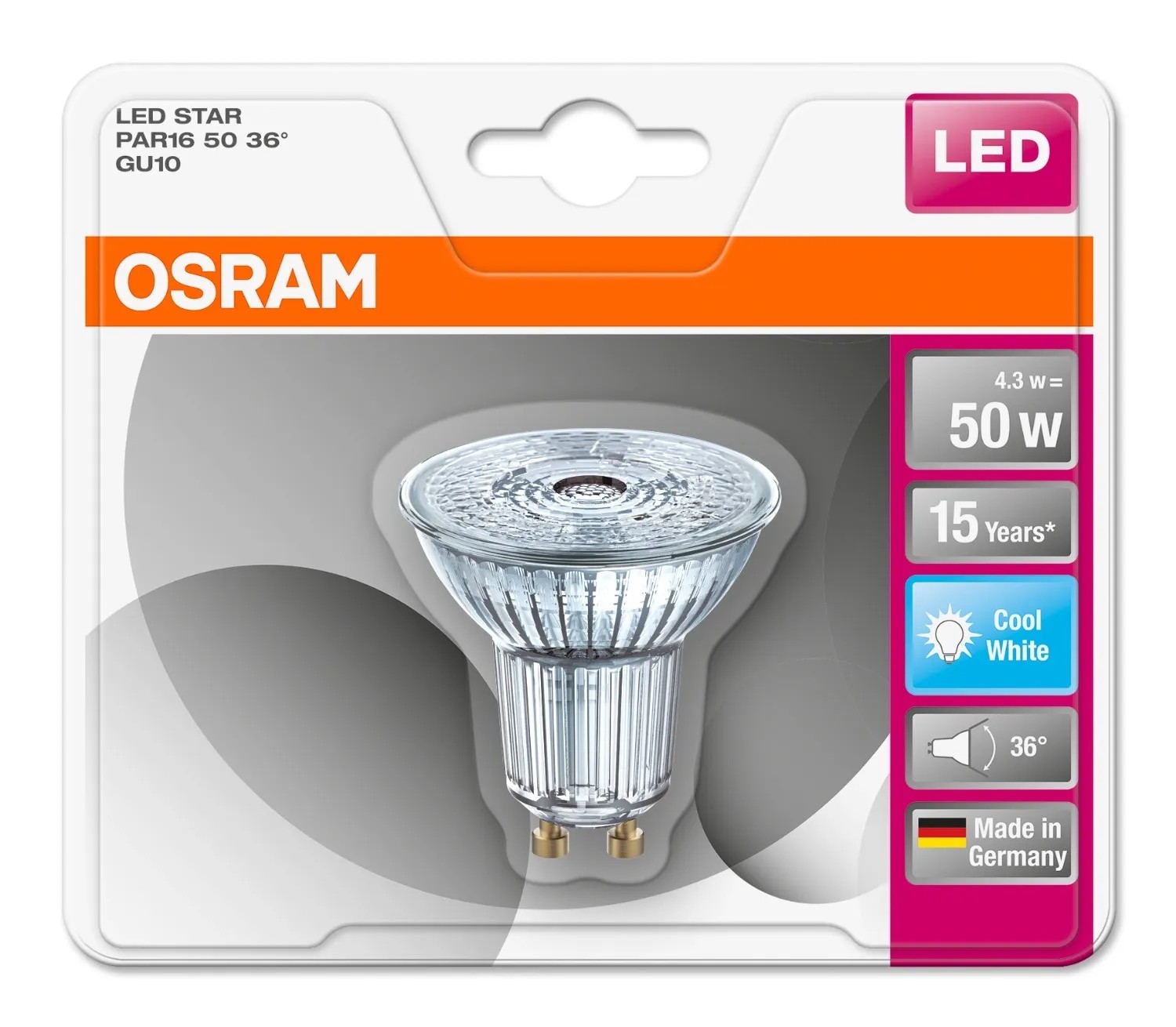 Osram LED star PAR16 spot izzó izzó, GU10 foglalattal.Fényerősség: 350 lm, 4,3 W (50 W hagyományos izzó kiváltására).