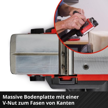 A masszív talplemez V alakú horonnyal rendelkezik az élek könnyű marásához. A párhuzamvezetővel egyenes és pontos gyalulási munkát végezhet, a munkadarab élével párhuzamosan. Opcionálisan felszerelheti a falcmélységütközőt, ha a munkadarabot legfeljebb 8 mm-es sarkokkal szeretné ellátni. A TCT forgó gyalukés kiváló minőségű felületet eredményez. Az automatikus parkoló talp megvédi a gyalukést és a munkadarabot, ha a gyalut egyszer félreteszi.