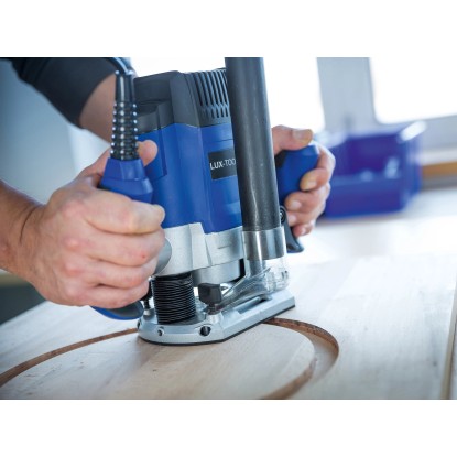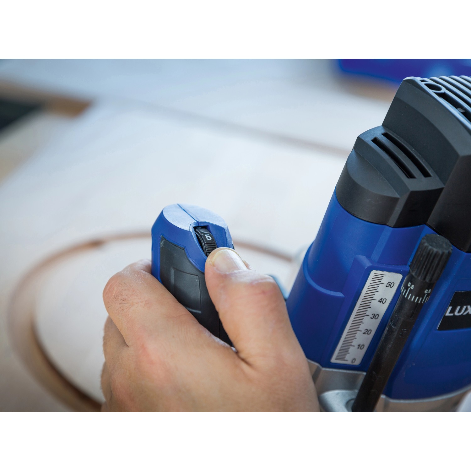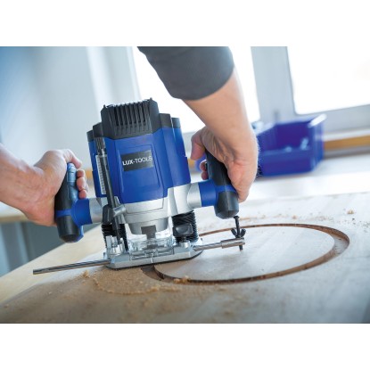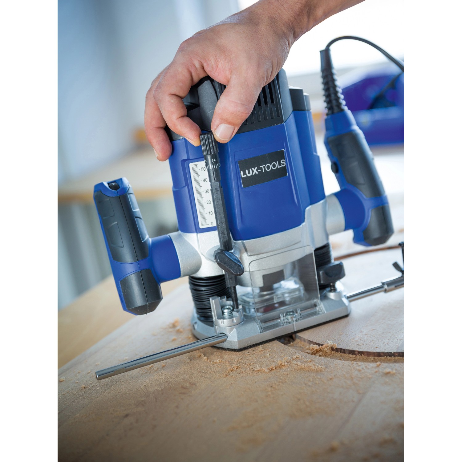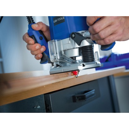 A LUX-TOOLS OF-1200 felsőmaró kiválóan alkalmas hornyok erőteljes marásához vagy sima fazetták és profilok készítéséhez. Elsősorban aprólékos famunkákhoz alkalmas. 1200 W névleges teljesítményével és 50 mm löketmagasságával a készülék gyorsan és erőteljesen vág. Az üresjárati fordulatszám 30 000/perc (fordulat). Egy beállítókerék segítségével kényelmesen előre kiválaszthatja a fordulatszámot, és bármikor módosíthatja azt. Az elérhető fugamélység 50 mm. A készülék nagyon pontos finom-mélységbeállítóval és revolverütközővel rendelkezik.