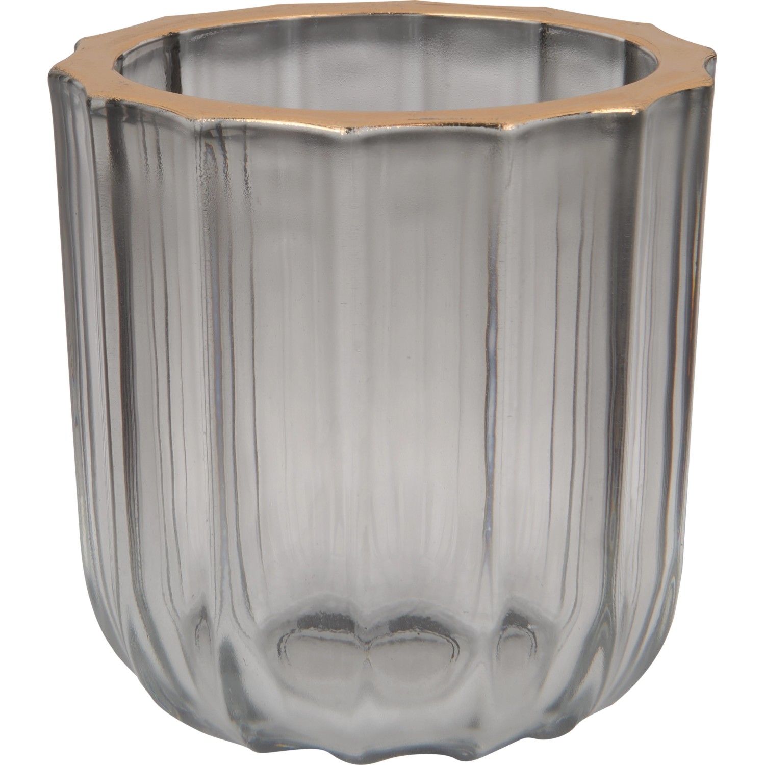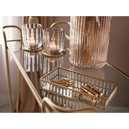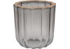 A ModernAntique kollekció kerek teamécses tartója egyénileg kombinálható dekorációs elem a belső terekbe. Időtlen dizájnt kínál, amely harmonikusan illik számos berendezéshez. A 9 cm x 9 cm (Ma x átmérő) méretű mécses elegáns bordázott szerkezetének és aranyszínű felső peremének köszönhetően szemet gyönyörködtető látványt nyújt. Hagyományos teamécsessel való használata látványos fényvisszaverődést teremt a környezetében. A gyertyatartó szürkére színezett átlátszó üvegből készült. Az anyagot ellenálló és könnyen tisztítható tulajdonságok jellemzik. Az üveget elhelyezheti az étkezőasztalon, a komódon vagy az ablakpárkányon. Sima aljának köszönhetően a felületek védve vannak.