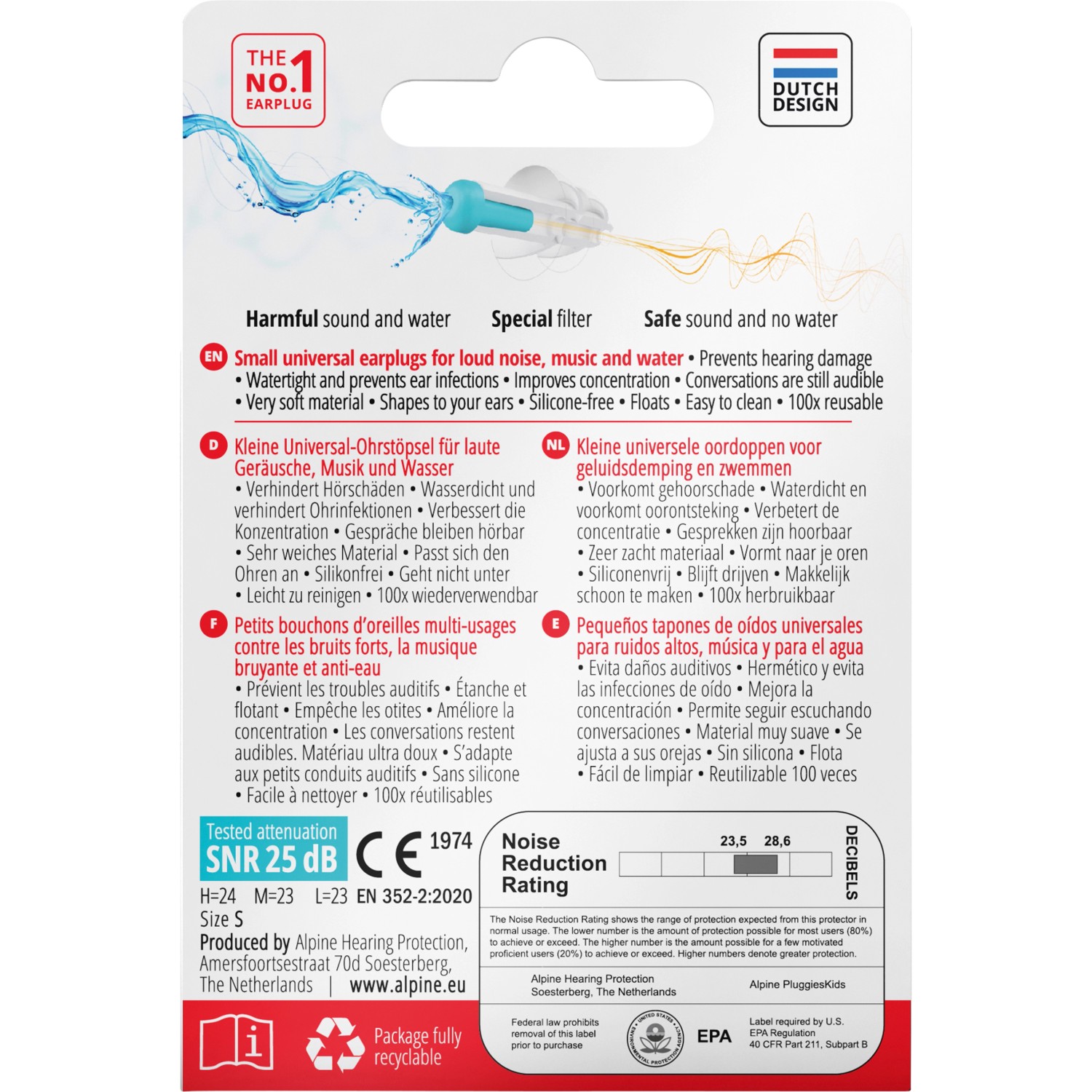 A többször használható Alpine füldugó kényelmes viselet, és védi a hallását a zajtól. Kifejezetten gyermekek számára készültek, mert tompítják a repülőgépek hangerejét és a hangos zenét. Vízben is viselhető fülvédőként. A füldugók felülete szennyeződéstaszító, így szappannal és vízzel könnyen tisztítható. Könnyen behelyezhetők a fülbe, és biztonságosan tárolhatók a mellékelt porálló tokban.