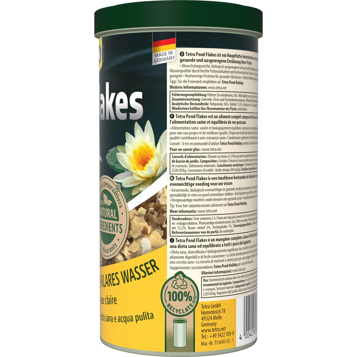 A Tetra Pond lemezes haleledel úszó és lassan lesüllyedő alaptáplálék a halak számára. Az eledel ennek révén kiválóan alkalmas a kerti tó minden fiatal és kicsi hala számára. A lemezes keverék változatos és biológiailag kiegyensúlyozott táplálék.