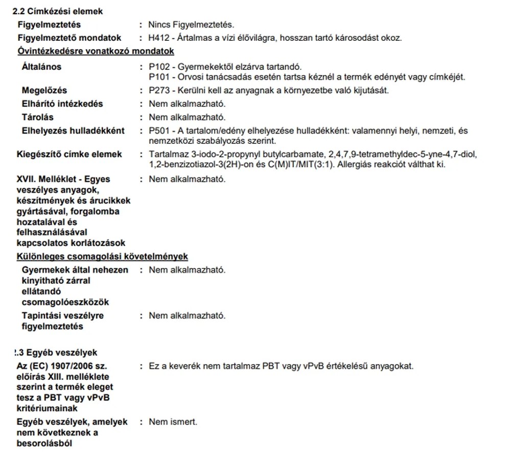 | Alk. gyermekjátékhoz (DIN EN 71-3 bevizsg.): | Gyermekjátékhoz nem alkalmas |