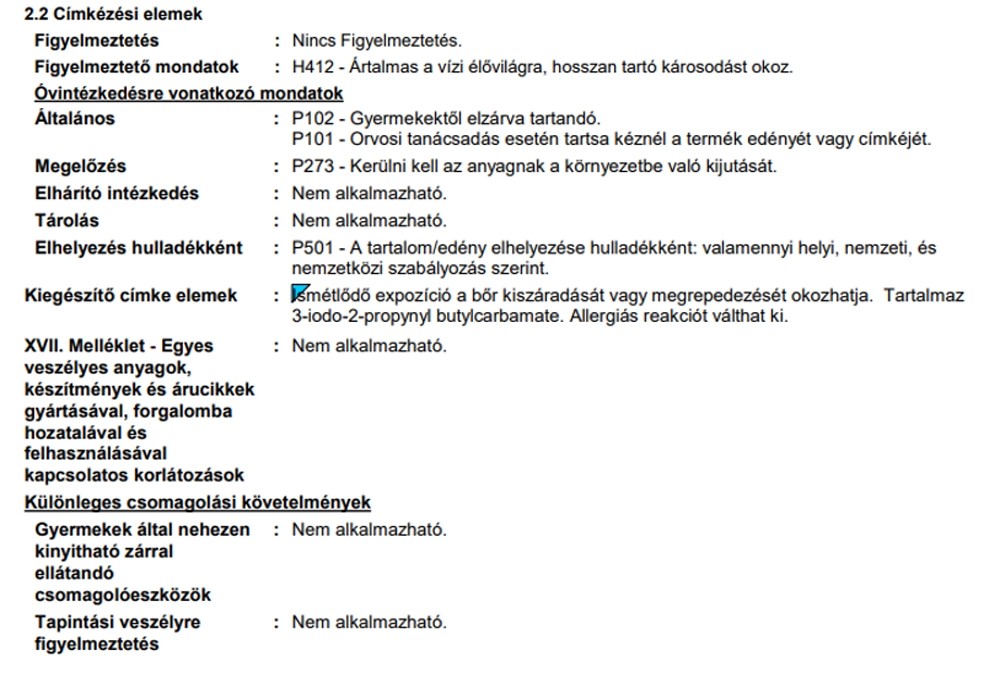 | Alk. gyermekjátékhoz (DIN EN 71-3 bevizsg.): | Gyermekjátékhoz nem alkalmas |