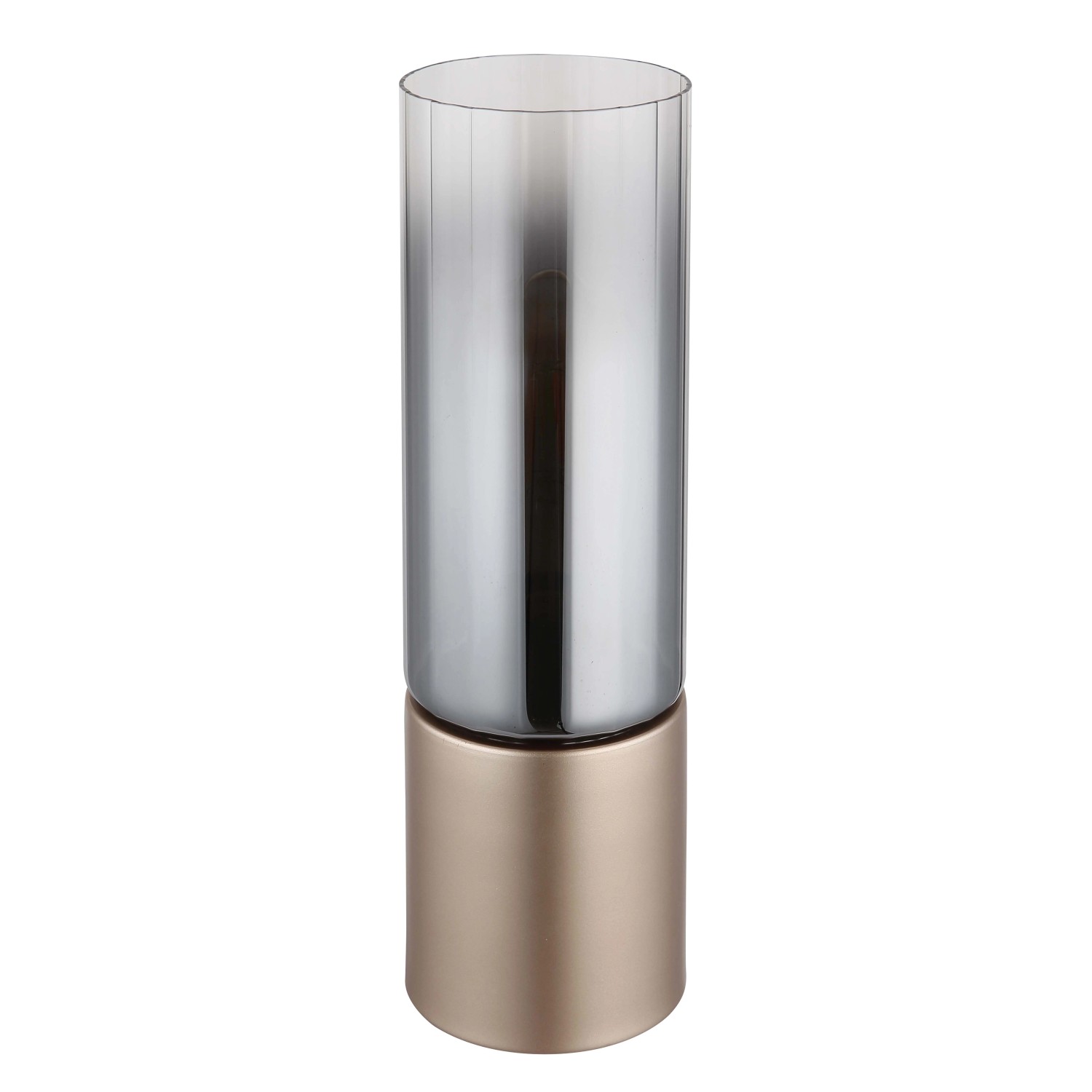 Asztali lámpa, fém cappuccino matt, füstszínű/átlátszó színátmenetes barázdált üveg, fehér textil kábel, érintésre ki/be kapcsolás.